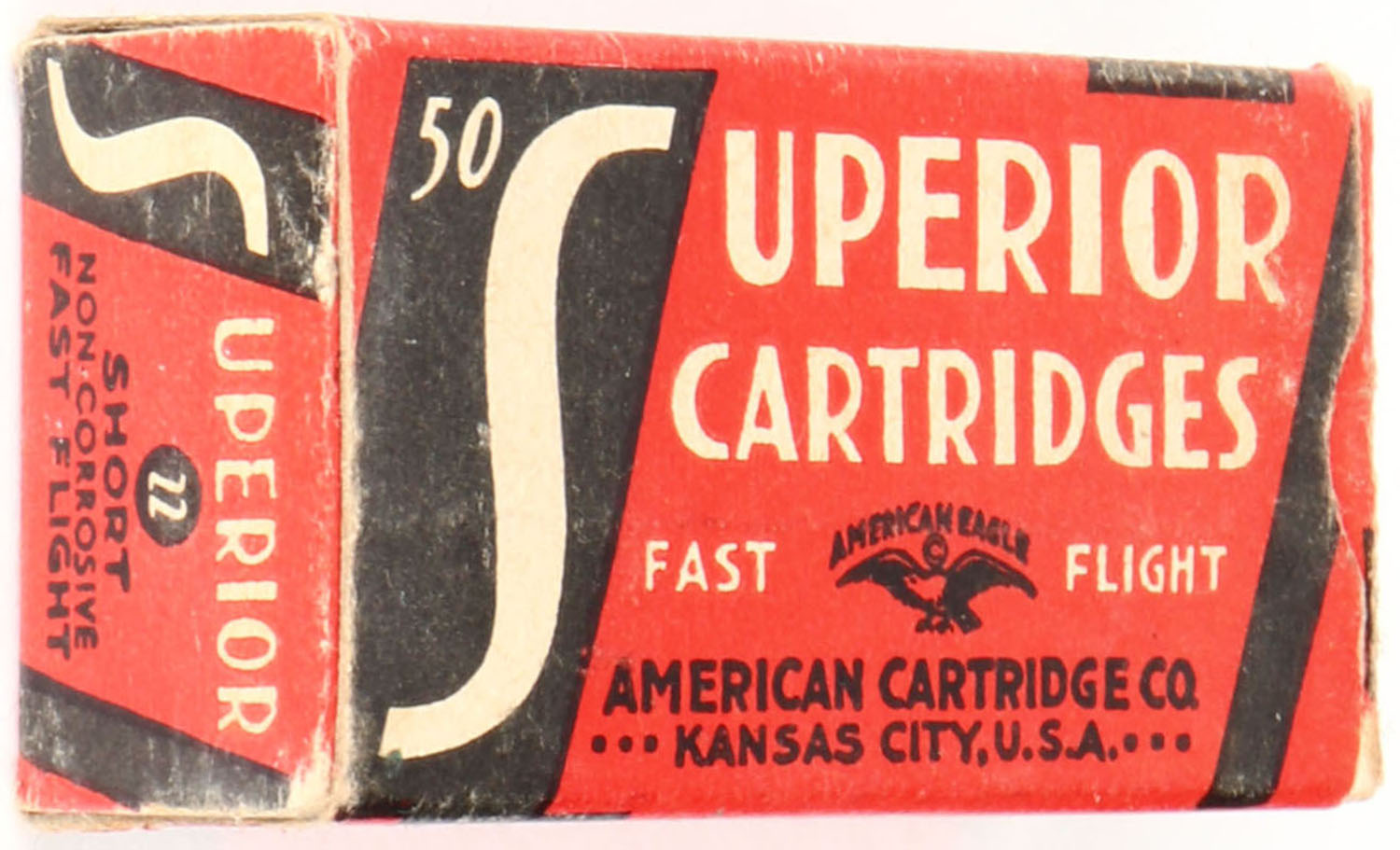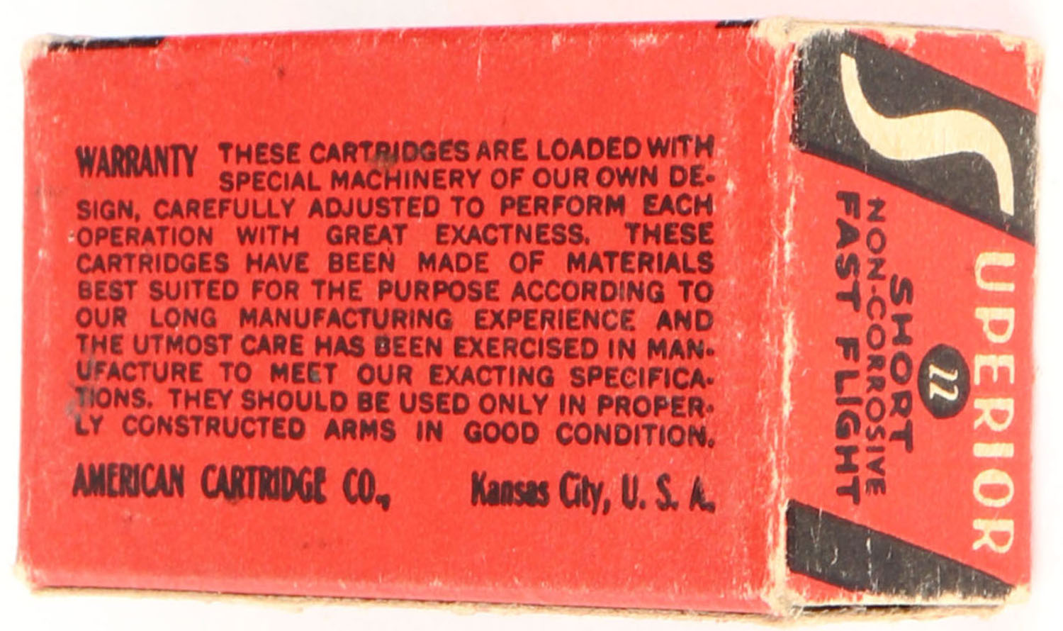American, Superior Cartridges, .22 Short, Fast Flight, RHWeb: ACC-2 S-1a, Partial 40rds., 1pc. Red black & white box, box is solid with excellent color, very minor age soiling & shelf wear, minor corner wear, edges are crisp, end flaps are solid, ammo is excellent. Grade: Excellent - Value: 10 to 16