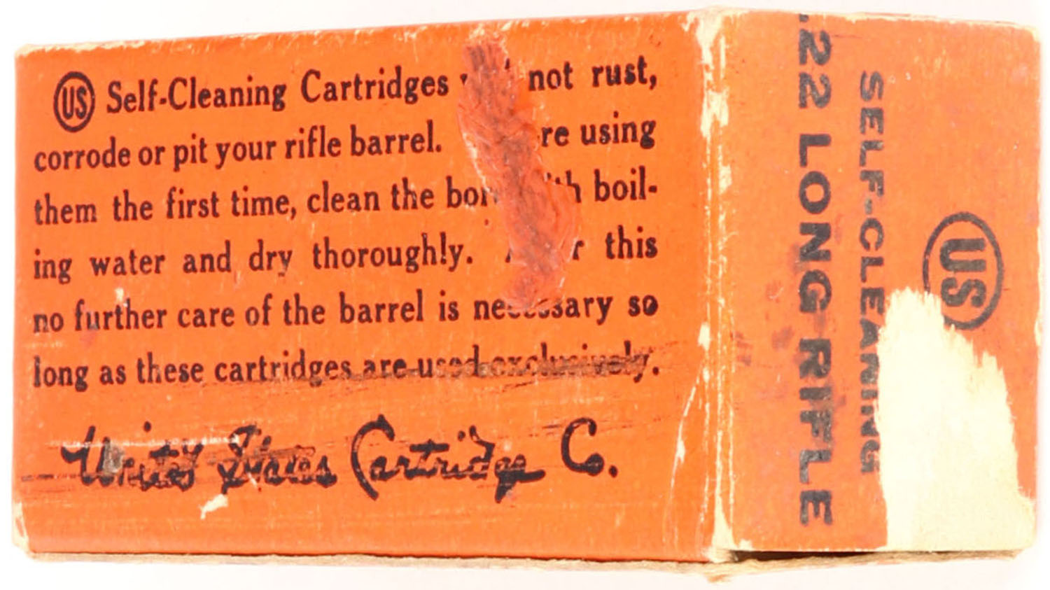 U.S., Self-Cleaning, .22 Long Rifle, RHWeb: US-10A LR-1a, Full, 1pc. Orange & black box, box is solid with excellent color, minor age soiling & corner wear, edges are crisp, end flaps are solid, ammo is very good. Grade: Very Good ++ - Value: 50 to 75