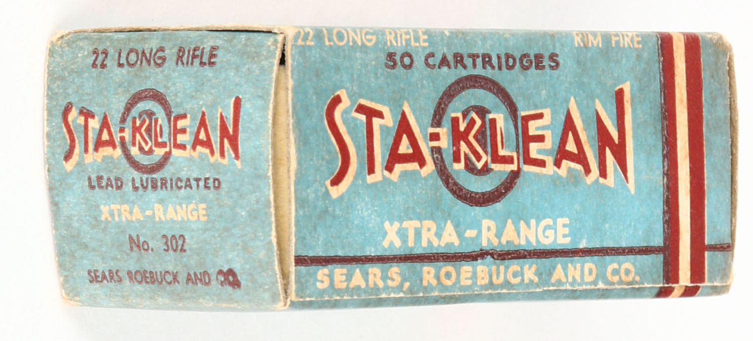 Sears, Sta-Klean, .22 Long Rifle, Xtra-Range, RHWeb: SEARS-6 LR-3, Full, 1pc. Blue white & maroon box, box is solid with very good color, some age soiling, very minor corner wear, edges are crisp, end flaps are solid, ammo is excellent. Grade: Excellent - Value: 16 to 24