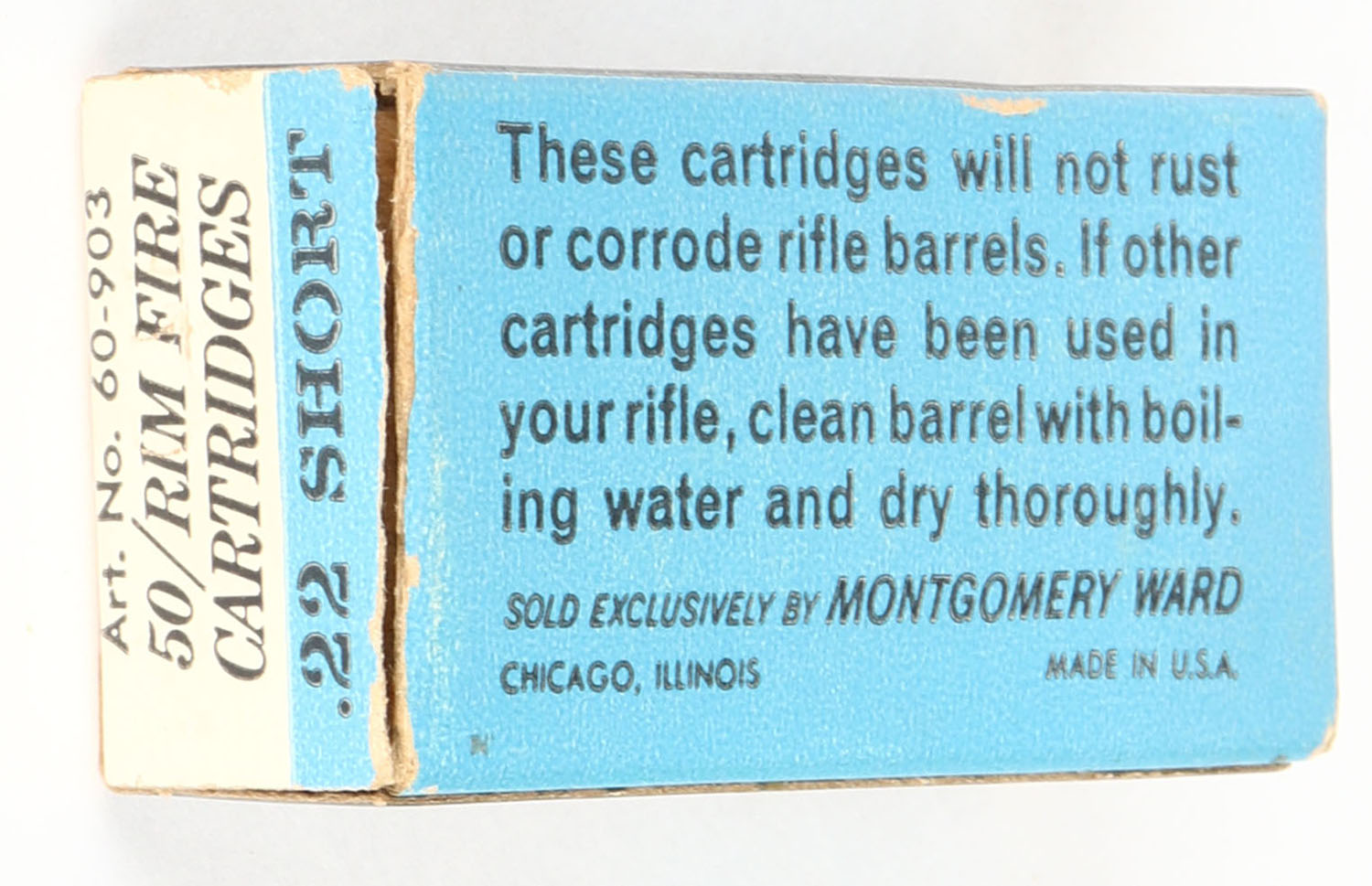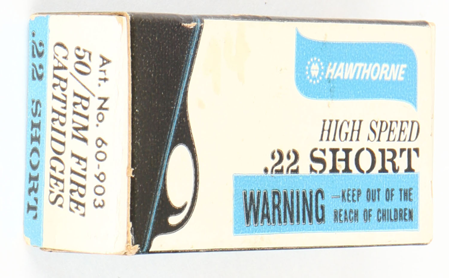 Wards, Hawthorne, .22 Short, High Speed, RHWeb: MW-7 S-1b, Full, 1pc. White black & blue box, right end flap is torn, excellent color, very minor age soiling & corner wear, edges are crisp, left end flap is solid, ammo is good. Grade: Very Good - Value: 8 to 12