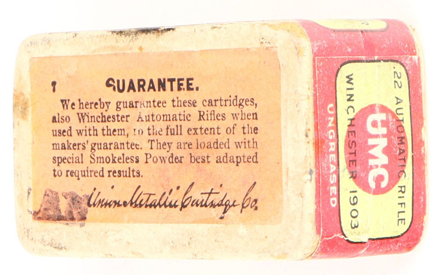 UMC, .22 Automatic Rifle, Smokeless, Ungreased, RHWeb: UMC-12 WA-2, FULL & SEALED, 2pc. Buff box with green/red top & side sealing labels, box is solid with very good color, some age soiling, minor edge & corner wear, labels are intact. Grade: Very Good + - Value: 100 to 200
