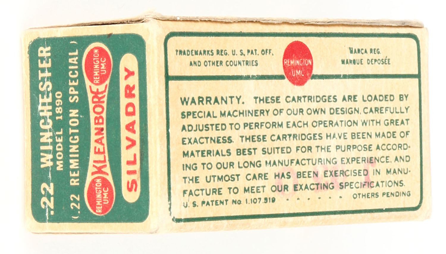 Winchester, Silvadry Kleanbore, .22 Winchester Rim Fire (.22 Remington Special), Full, 1pc. Green buff & red dog bone box, box is solid with excellent color, very minor age soiling & corner wear, edges are mostly crisp, end flaps are solid, ammo is excellent. Grade: Excellent + - Value: 160 to 240