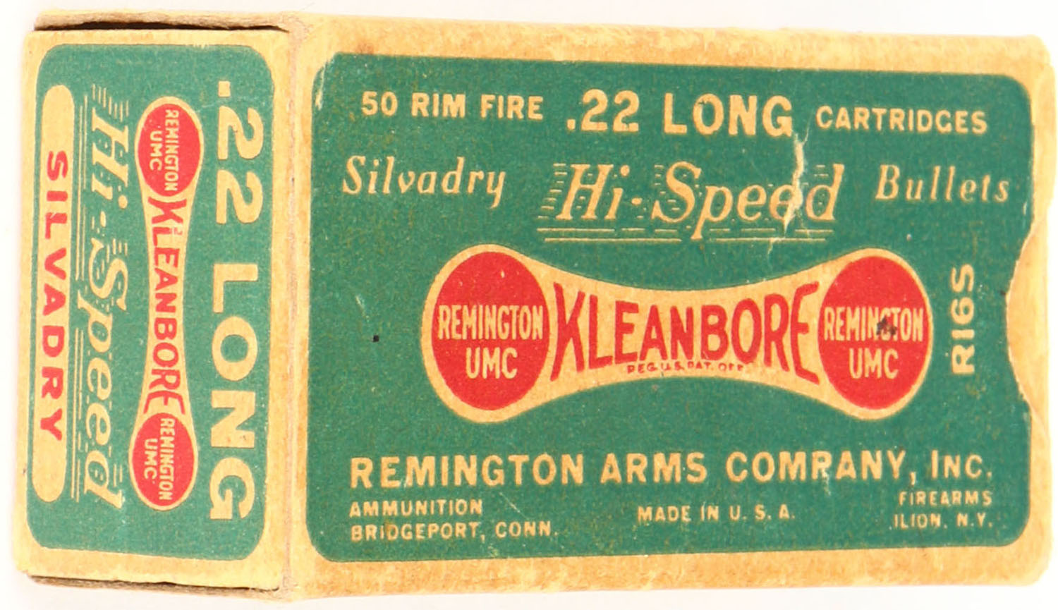 Remington, Silvadry Hi-Speed Kleanbore, .22 Long, RHWeb: REM-7.5 L-1b, Full, 1pc. Green buff & red dog bone box, box is solid with excellent color, very minor shelf & corner wear, edges are mostly crisp, end flaps are solid, ammo is excellent. Grade: Excellent - Value: 70 to 100