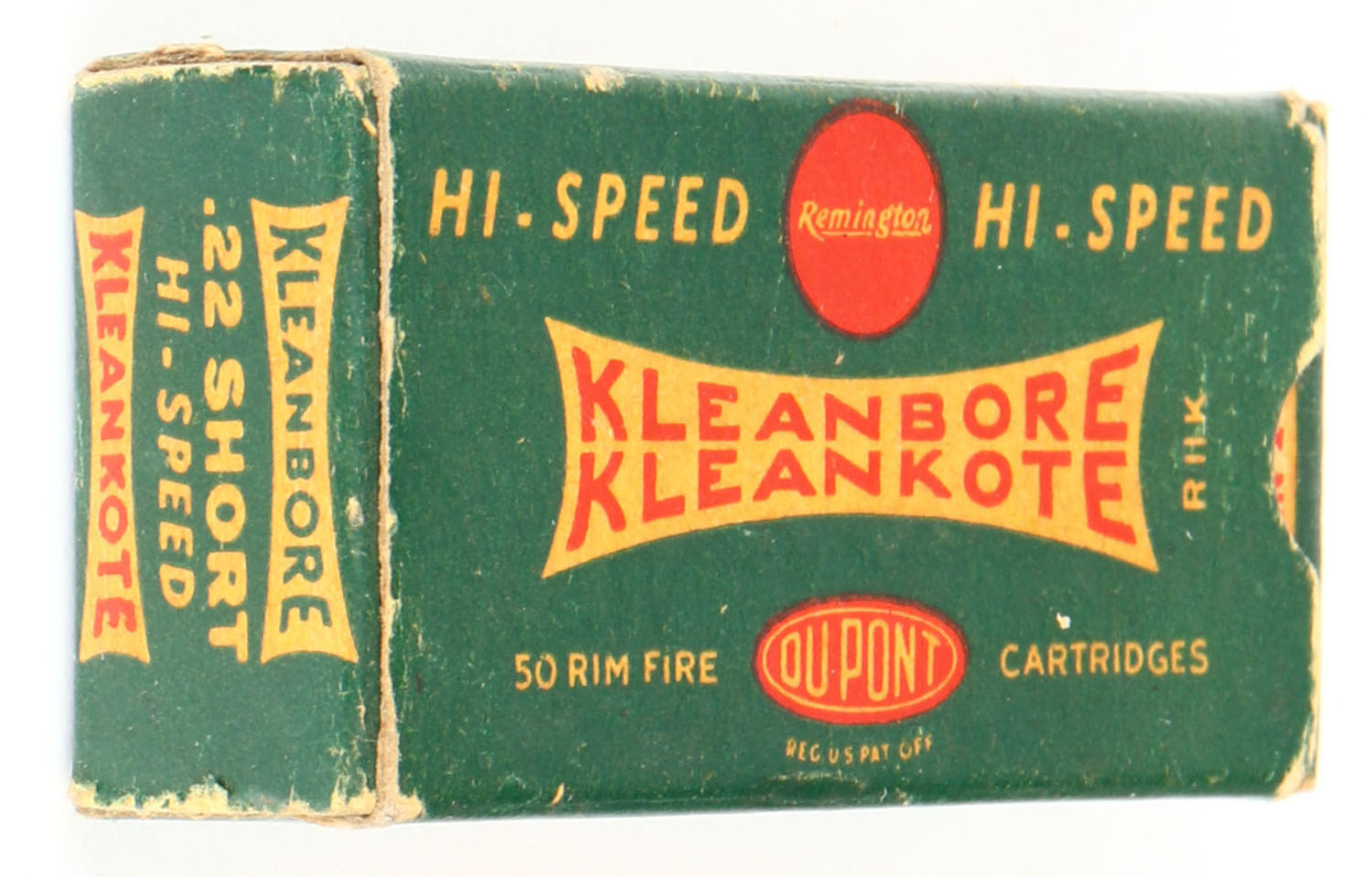 Remington, Kleanbore Kleankote, .22 Short, Hi-Speed, RHWeb: REM-9 S-1b, Full, 1pc. Green buff & red box, box is solid with excellent color, minor age soiling, some corner wear, edges are crisp, end flaps are solid, ammo is very good. Grade: Excellent - Value: 20 to 30