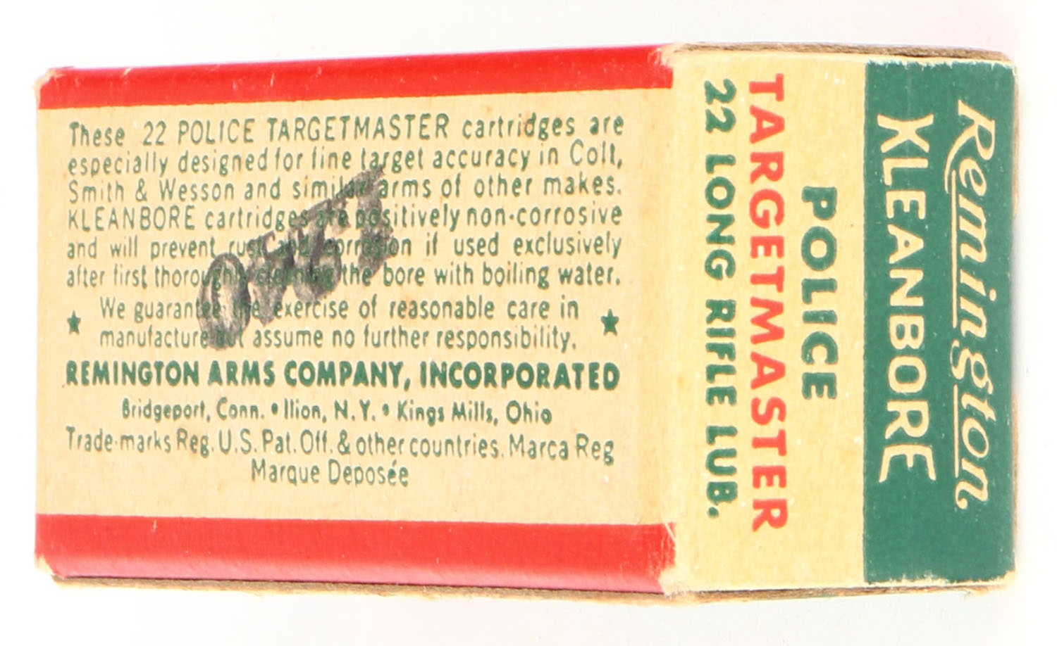 Remington, Police Targetmaster, .22 Long Rifle, Kleanbore, RHWeb: REM-69 LR-2c, Full, 1pc. Green buff & red box, box is solid with excellent color, very minor corner wear, edges are crisp, end flaps are solid, ammo is excellent. Grade: Excellent + - Value: 50 to 75