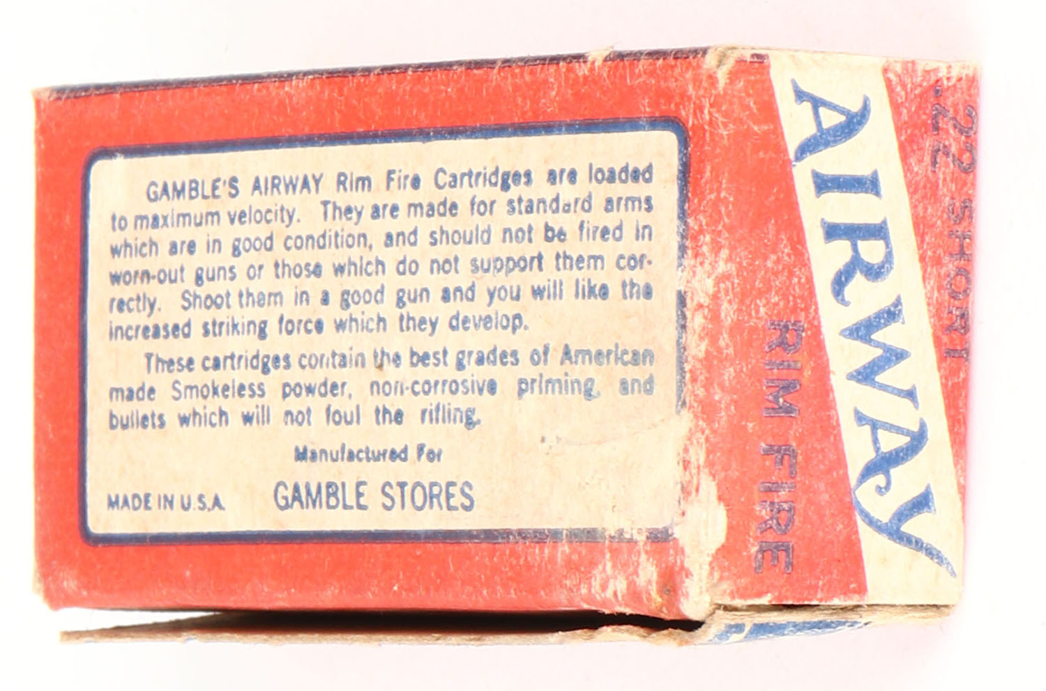 Gambles, Airway, .22 Short, RHWeb: GS-1 S-1c, Full, 1pc. Red blue & white box, box is solid with very good to excellent color, minor age soiling & corner wear, factory seam has unadhered, edges are crisp, end flaps are solid, ammo is very good. Grade: Very Good + - Value: 30 to 45