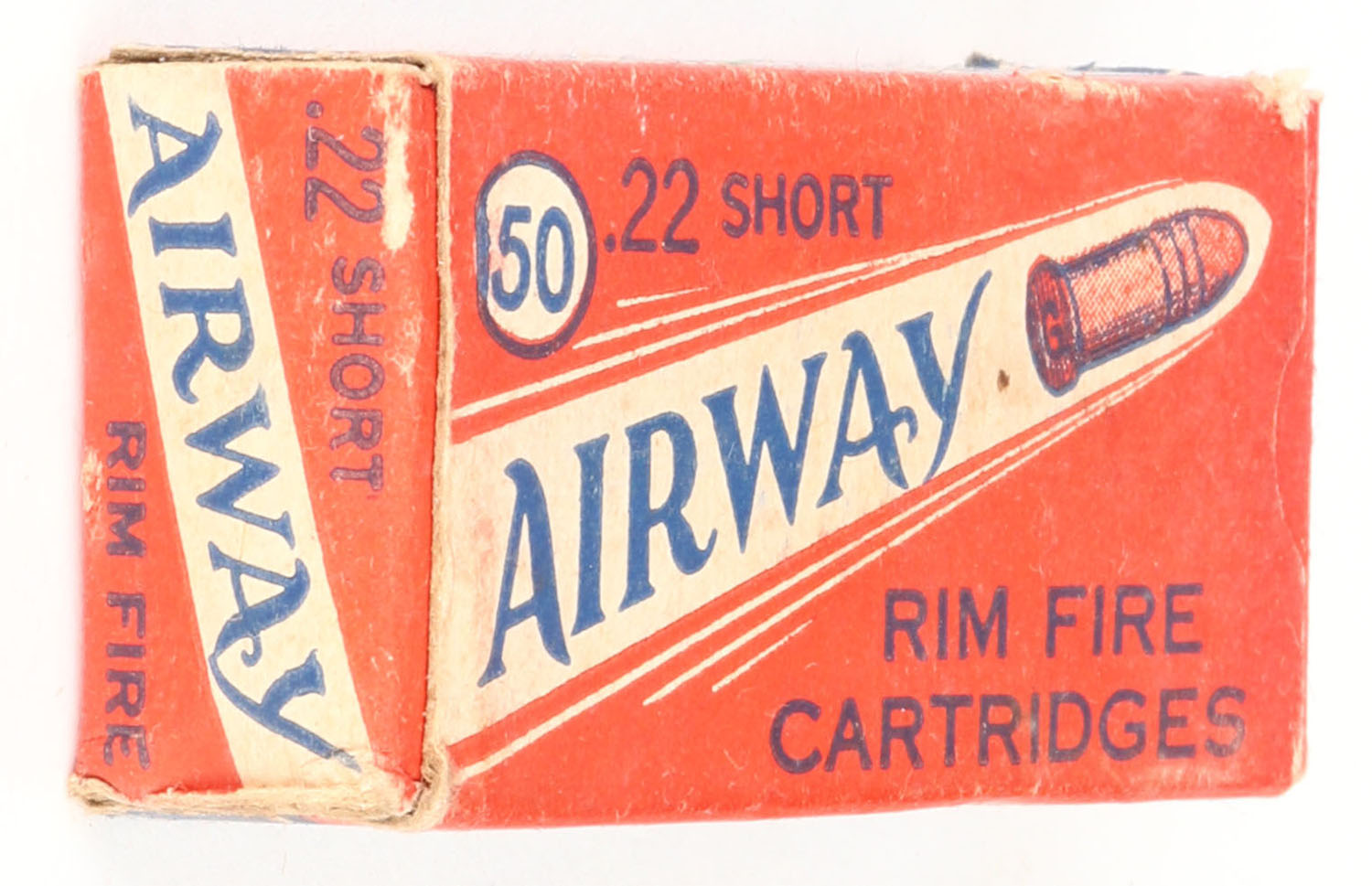 Gambles, Airway, .22 Short, RHWeb: GS-1 S-1c, Full, 1pc. Red blue & white box, box is solid with excellent color, minor age soiling & corner wear, very minor edge wear, end flaps are solid, ammo is excellent. Grade: Very Good ++ - Value: 40 to 60
