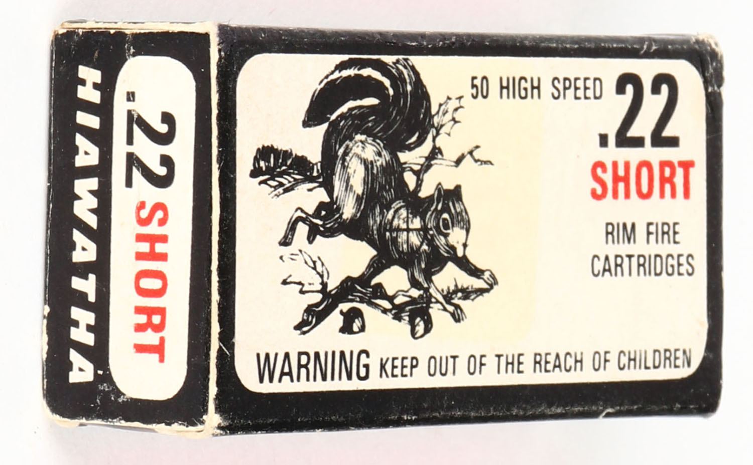 Gambles, Hiawatha, .22 Short, High Speed, RHWeb: GS-5 S-1a, Full, 1pc. Black white & red box, box is solid with excellent color, sticker stain on top, very minor corner wear, edges are mostly crisp, end flaps are solid, ammo is excellent. Grade: Excellent - Value: 50 to 75