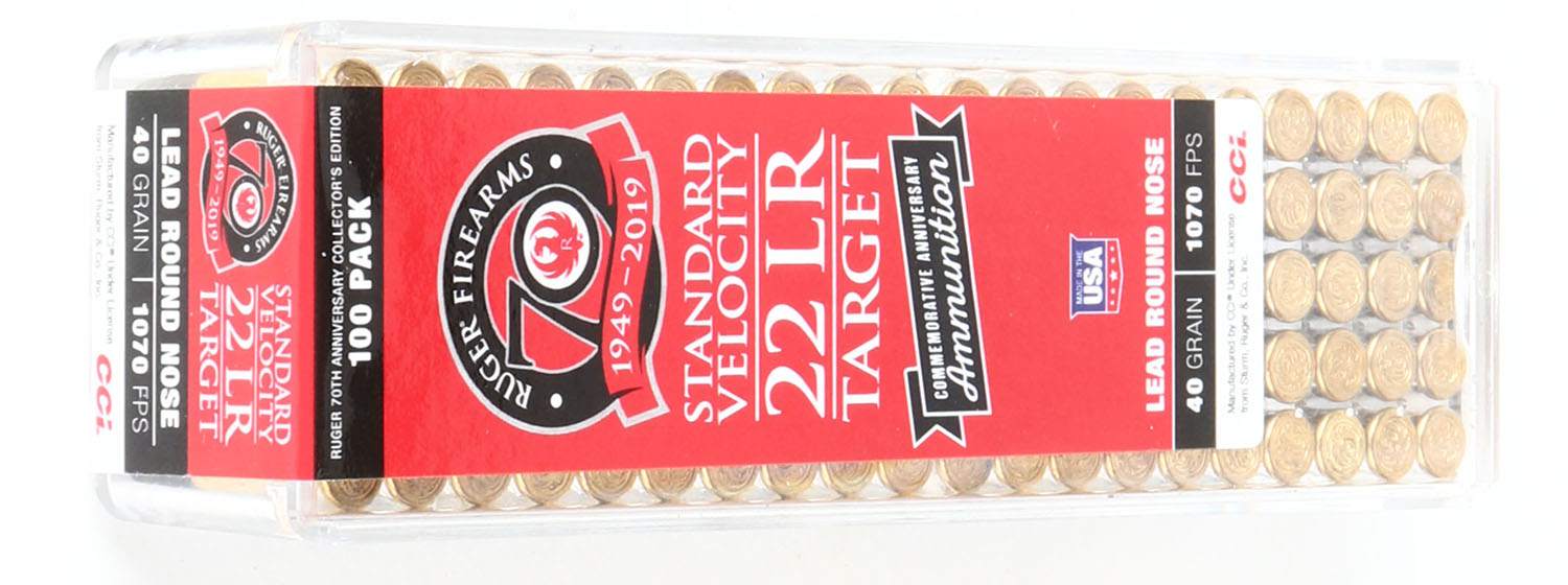 CCi, Ruger 70th anniversary commemorative, .22 Long Rifle, Standard Velocity, Not in RHWeb, Full & Sealed, 2pc. Clear plastic tray with red & black label, box is MINT, label is mint, ammo appears mint. Grade: MINT - Value: 20 to 30