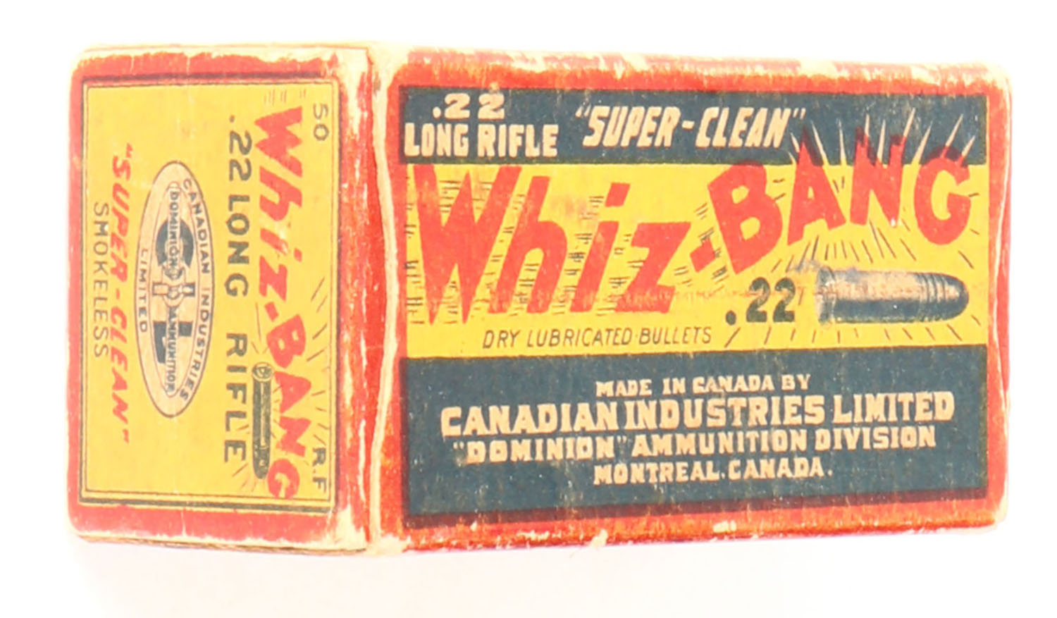 C.I.L., Whiz-Bang, .22 Long Rifle, Dry Lubricated Bullets, RHWeb: (Canada) CIL-2 LR-6, Full, 1pc. Red yellow & blue box, box is solid with very good to excellent color, some age soiling & corner wear, minor edge wear, end flaps are solid, ammo is excellent. Grade: Very Good ++ - Value: 50 to 75