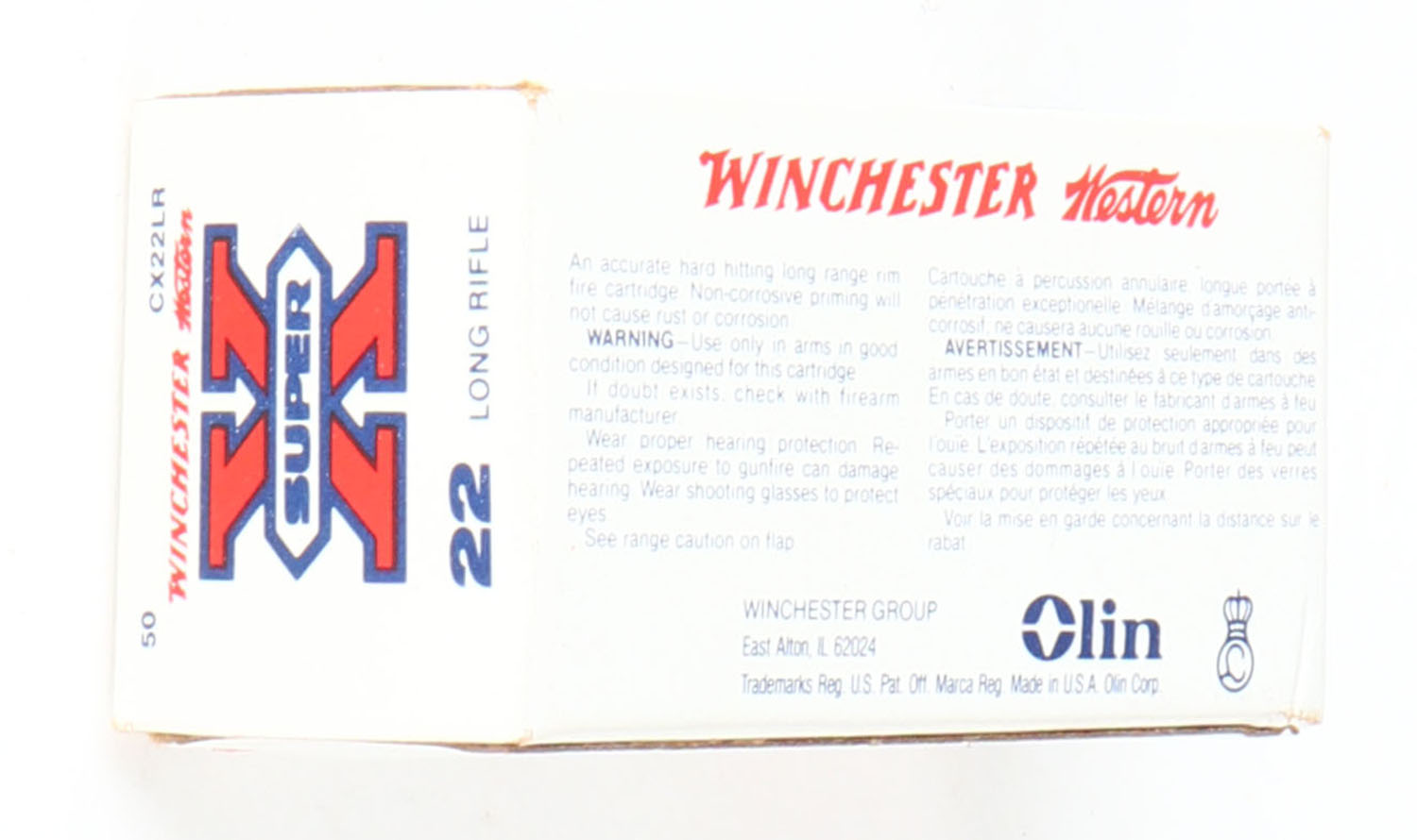 Winchester-Western (Canada), .Super X, .22 Long Rifle, RHWeb: (Canada) WRA-6 LR-1b, Full, 1pc. White red & black box, box is solid with minty color, corner ding on top front corner, corners otherwise mostly sharp, edges are crisp, end flaps are solid, ammo is minty. Grade: Excellent + - Value: 20 to 30