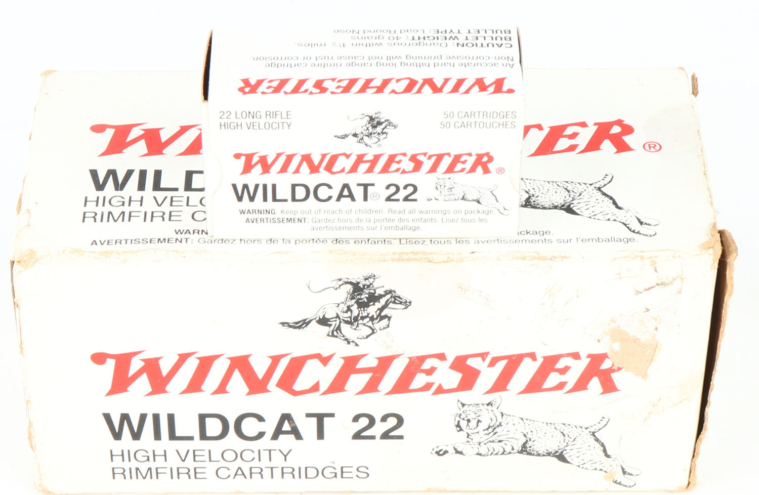 Winchester, Wildcat 22, .22 Long Rifle, High Velocity, Partial 9 boxes, 1pc. White black & red brick, brick is solid with very good color, staining to top & front, some corner wear, minor edge wear, end flaps are solid, inside boxes are minty. Grade: Very Good ++ - Value: 30 to 45