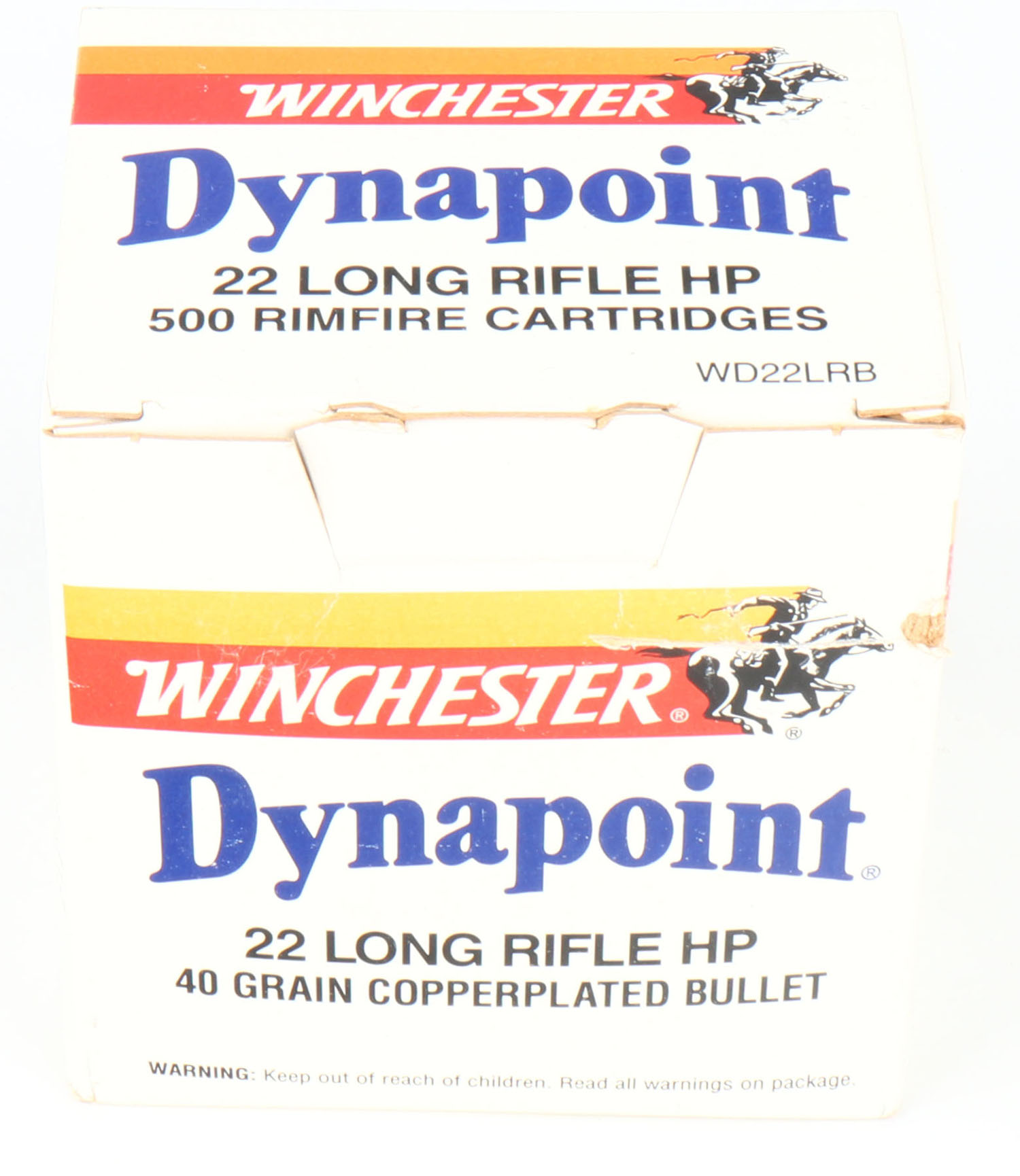 Winchester, Dynapoint, .22 Long Rifle Hollow Point, 40 Grain Copper Plated Bullet, Full, 500rds. 1pc. White red & orange bulk box, box is solid with excellent color, corners are sharp, edges are mostly crisp, top flap is solid, ammo is minty. Grade: Excellent ++ - Value: 30 to 45