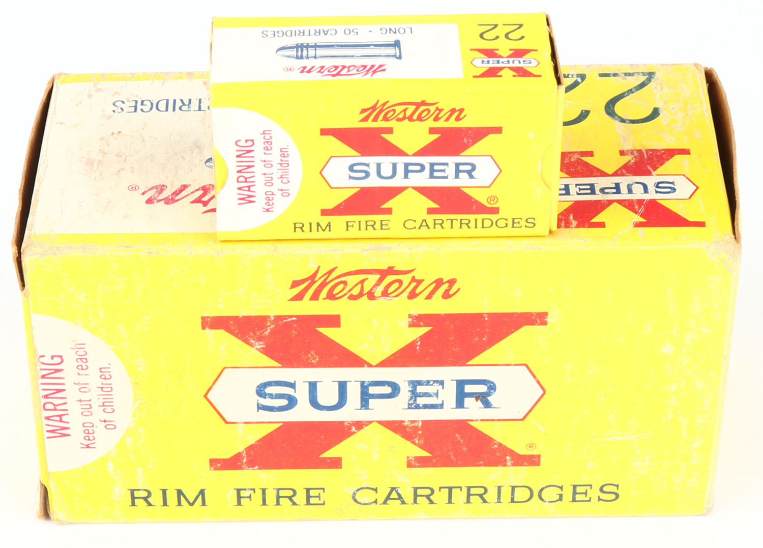 Western, Super X, .22 Long, 29 Gr. Lubaloy Coated Bullet, Full, 500rds. 1pc. Yellow white & red brick, brick is solid with very good color, shelf wear, some edge & corner wear, end flaps are solid, inside boxes are minty. Grade: Excellent - Value: 160 to 240