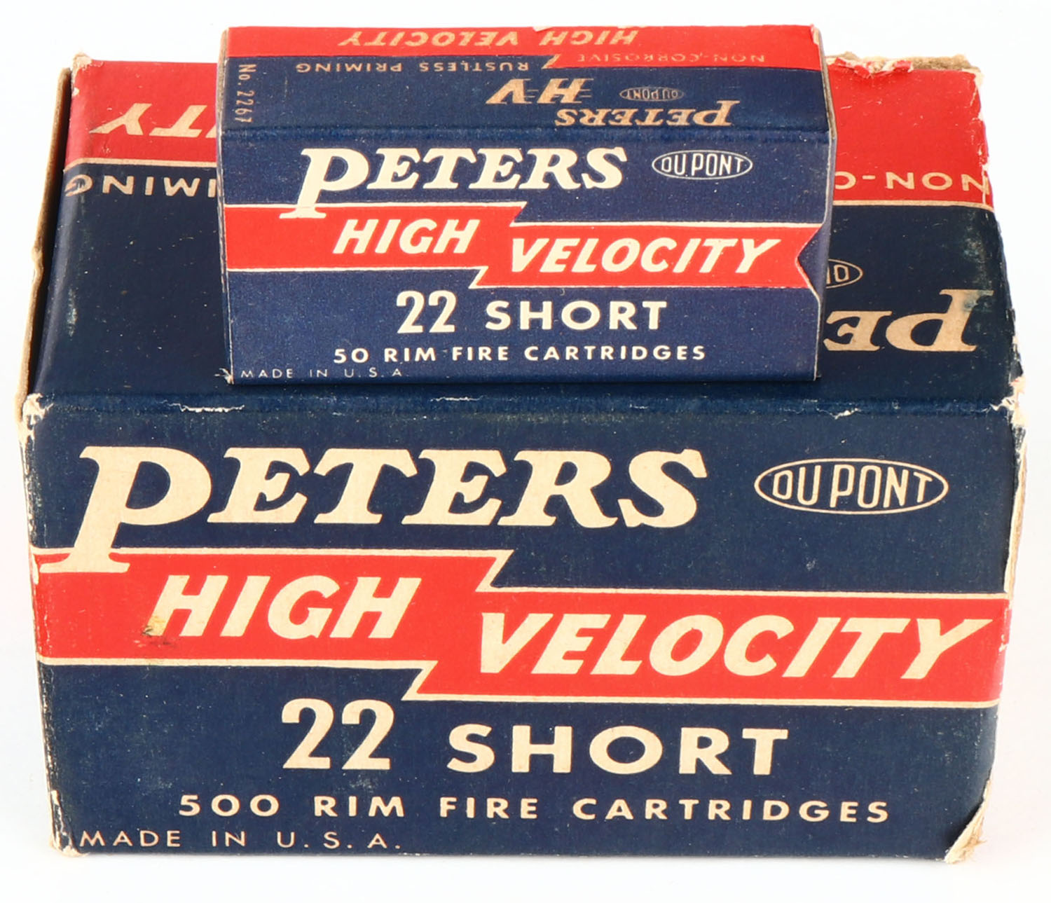 Peters, High Velocity, .22 Short, Full, 500rds. 1pc. Blue red & white brick, right end flap is torn, 3/4 seam split to bottom back edge, excellent color, very minor age soiling, some corner wear, edges are mostly crisp, left end flap is solid, inside boxes are excellent to minty. Grade: Good - Value: 100 to 150