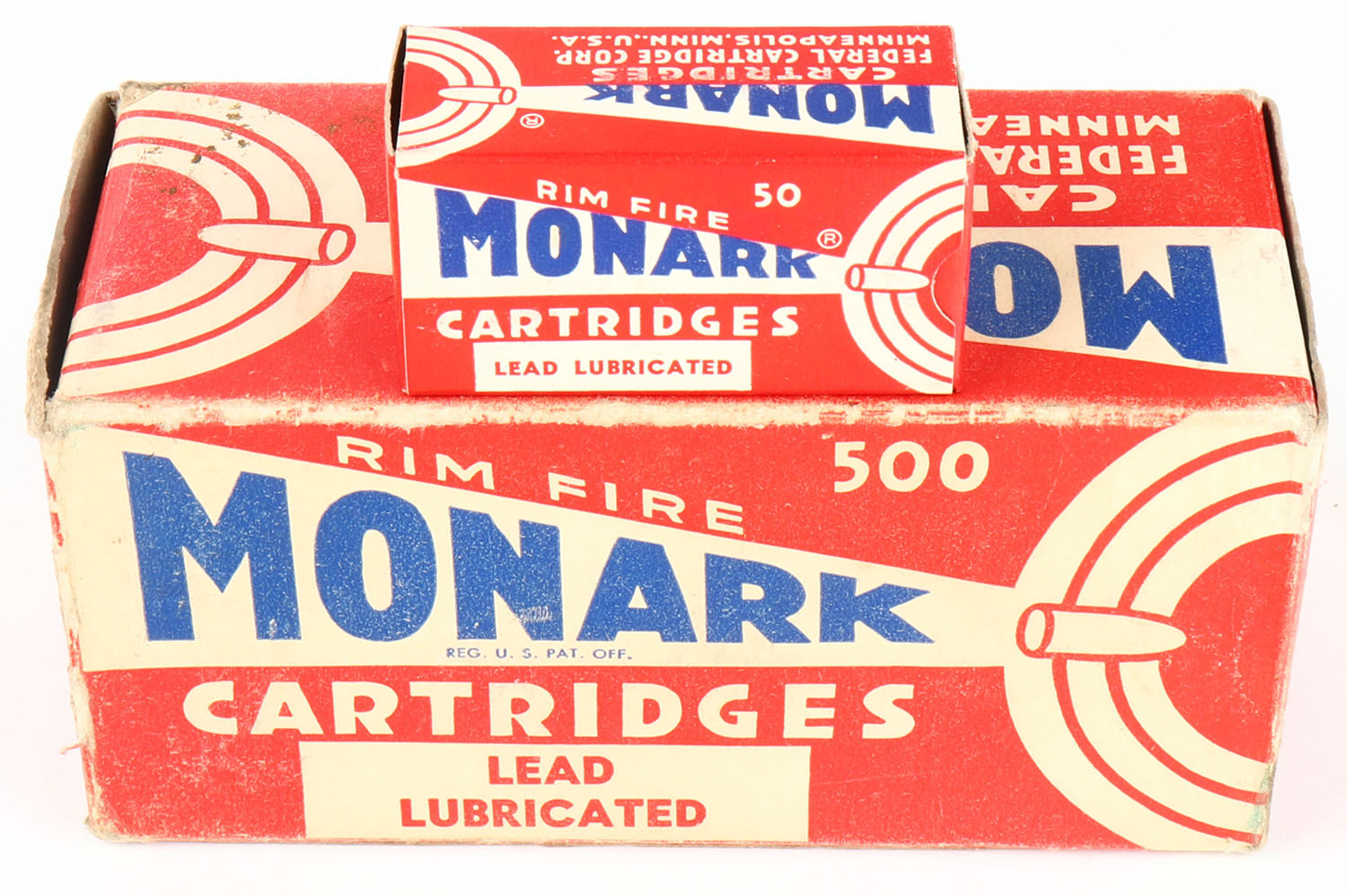 Federal, Monark, .22 Long Rifle, Lead Lubricated, Full, 500rds. 1pc. Red white & blue brick, brick is solid with very good color, minor age soiling, shelf wear, edge & corner wear, end flaps are solid, inside boxes are minty. Grade: Very Good + - Value: 70 to 100