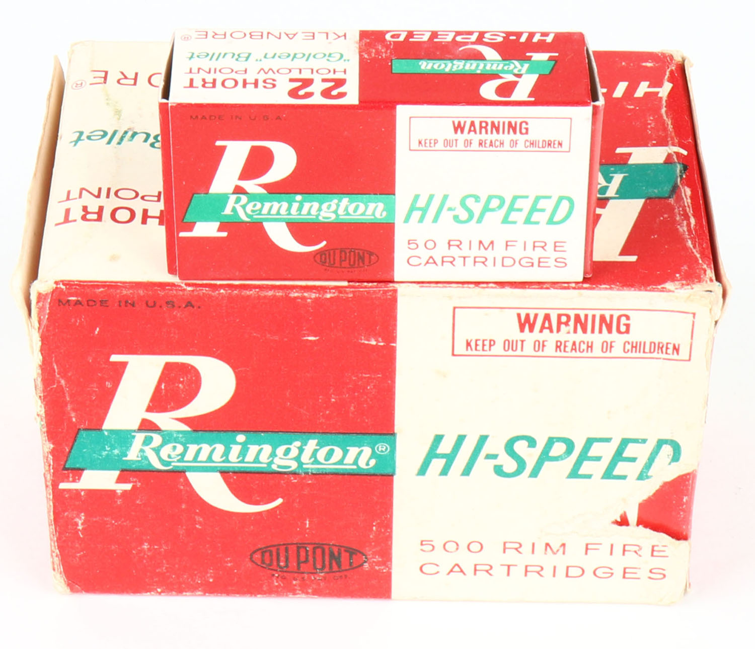 Remington, Hi-Speed, .22 Short Hollow Point, ''Golden'' Bullet, Full, 500rds. 1pc. Red white & green box, box is solid with excellent color, some shelf wear, corner wear, tear on top, minor edge wear, end flaps are solid, inside boxes are minty. Grade: Very Good + - Value: 120 to 180
