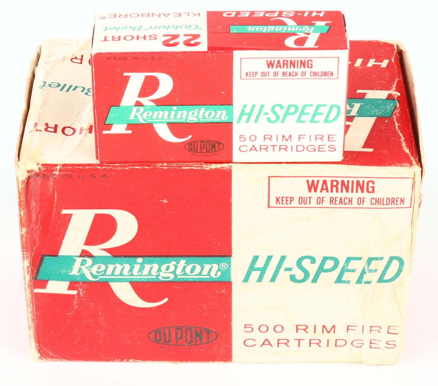 Remington, Hi-Speed, .22 Short, ''Golden'' Bullet, Full, 500rds. 1pc. Red white & green brick, right end flap is torn, very good color, some age soiling & shelf wear, some edge & corner wear, left end flaps are solid, (9) inside boxes are minty, (1) is excellent and has a corner ding. Grade: Very Good - Value: 50 to 75