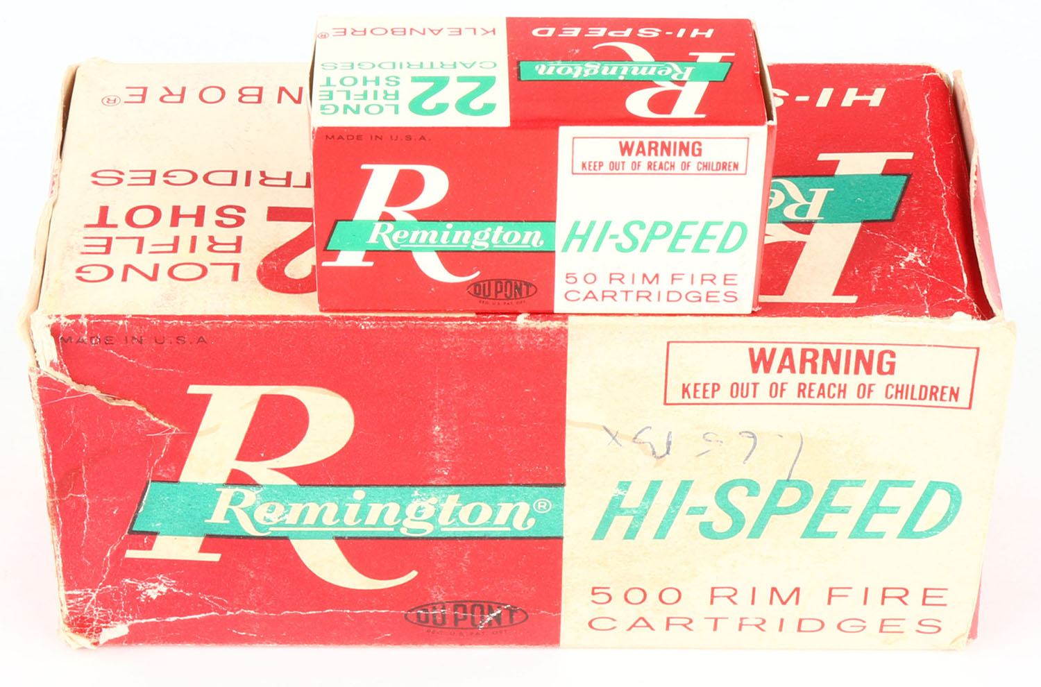 Remington, Hi-Speed, .22 Long Rifle Shot, Partial 4 boxes, 1pc. Red white & red brick, brick is solid with very good color, some age soiling, top has been written on, tearing on top, corner wear, some edge wear, end flaps are solid, inside boxes are minty. Grade: Good ++ - Value: 24 to 36
