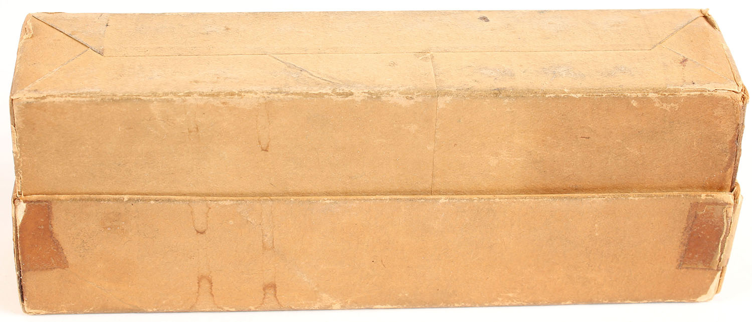 Winchester, Center Fire Cartridges, .45-75 Winchester, 350 Grain Lead Bullets, Full, 2pc. Buff box with green labels, box is solid with very good color, some age soiling, stain on top, tape on both ends of lid, some corner wear, minor edge wear, labels are intact, ammo is excellent. Grade: Very Good + - Value: 150 to 225