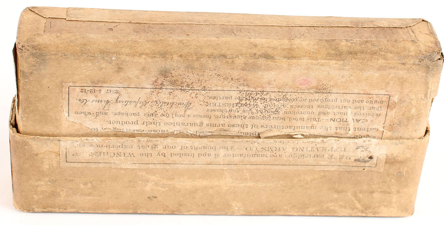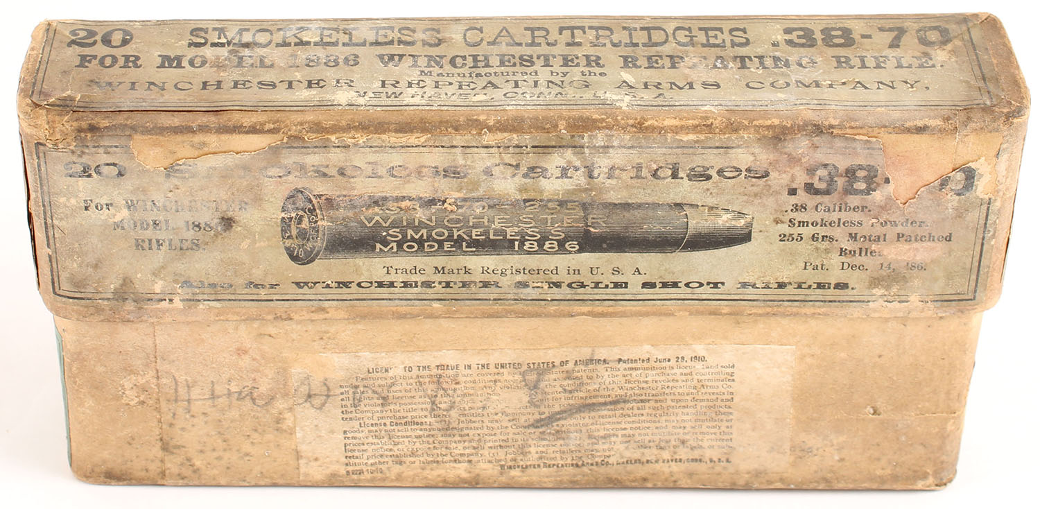 Winchester, Smokeless Cartridges, .38-70 Winchester, 255 Grs. Metal Patched Bullet, Full, 2pc. Buff box with green labels, box is solid with fair to good color, color fading, age soiling, shelf wear, some corner wear, minor edge wear, front has been written on, labels are intact, ammo is excellent. Grade: Good ++ - Value: 100 to 150