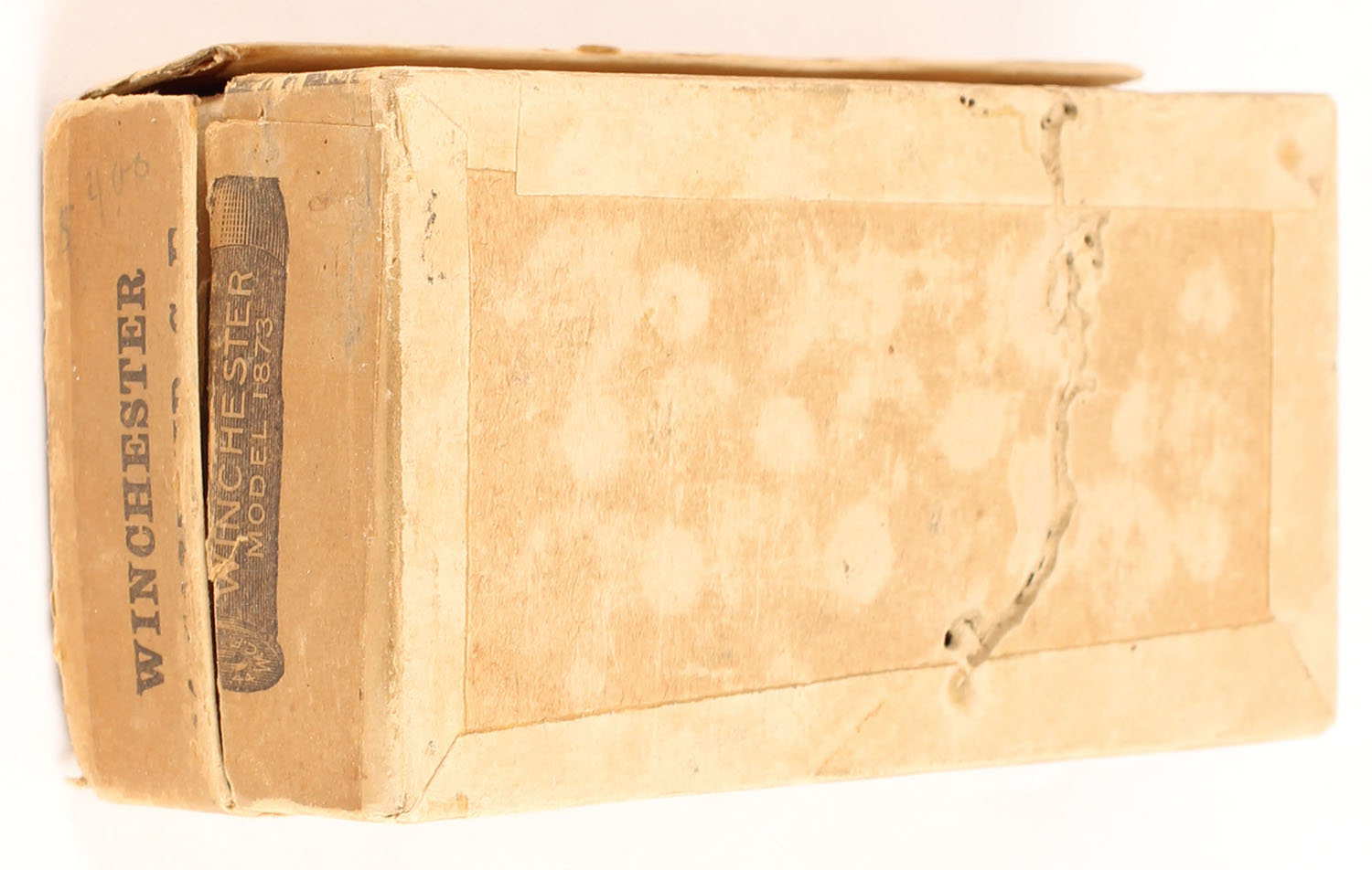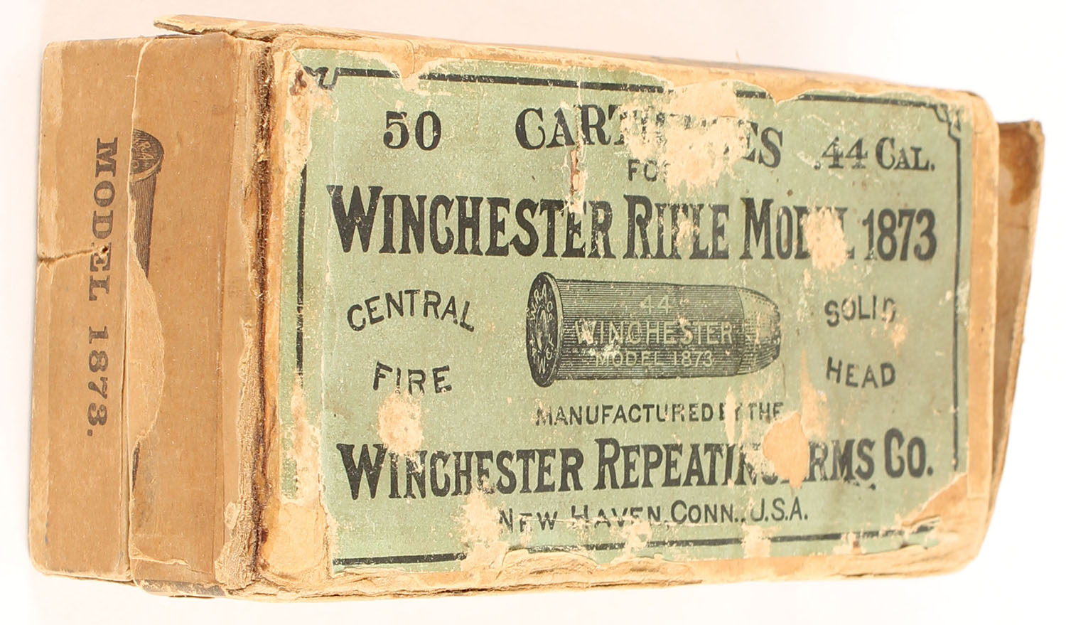 Winchester, Central Fire Cartridges, .44 Winchester, Solid Head, Full, 2pc. Buff box with green top & buff side sealing labels, vertical seam splits to both back corners of lid, seam split to right edge of lid, very good color, scuffing to top, edge & corner wear, labels are intact, ammo is good. Grade: Good ++ - Value: 150 to 225