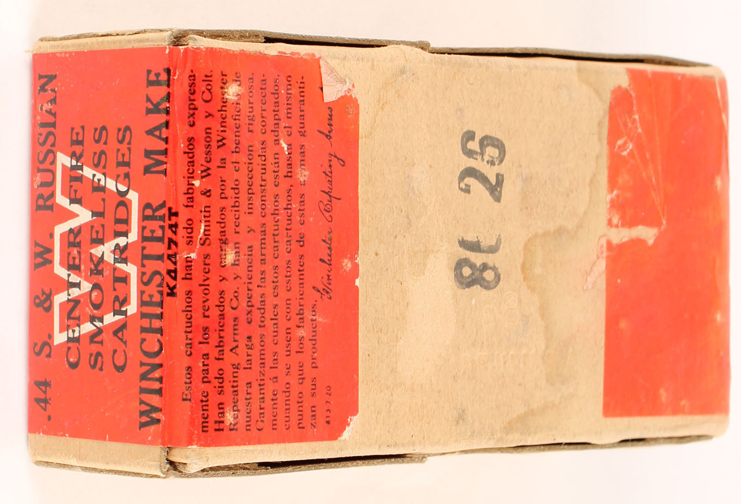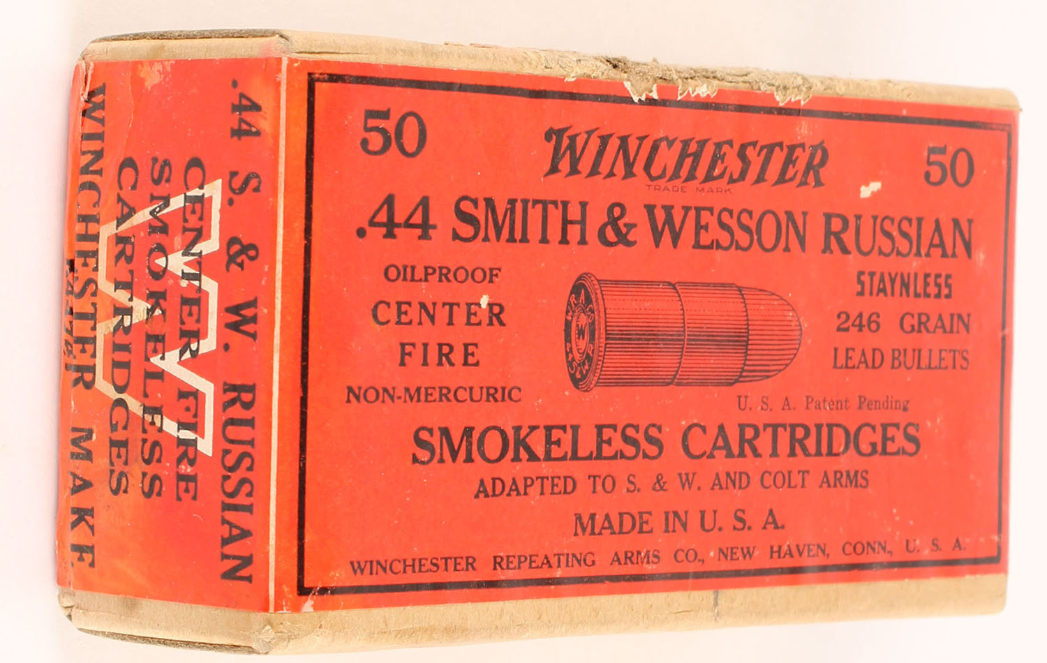 Winchester, Staynless, .44 Smith & Wesson Russian, 246 Grain Lead Bullets, FULL & SEALED, 2pc. Buff box with red wraparound label, box is solid with minty color, very minor shelf & corner wear, edges are mostly crisp, label is intact. Grade: Excellent + - Value: 48 to 72