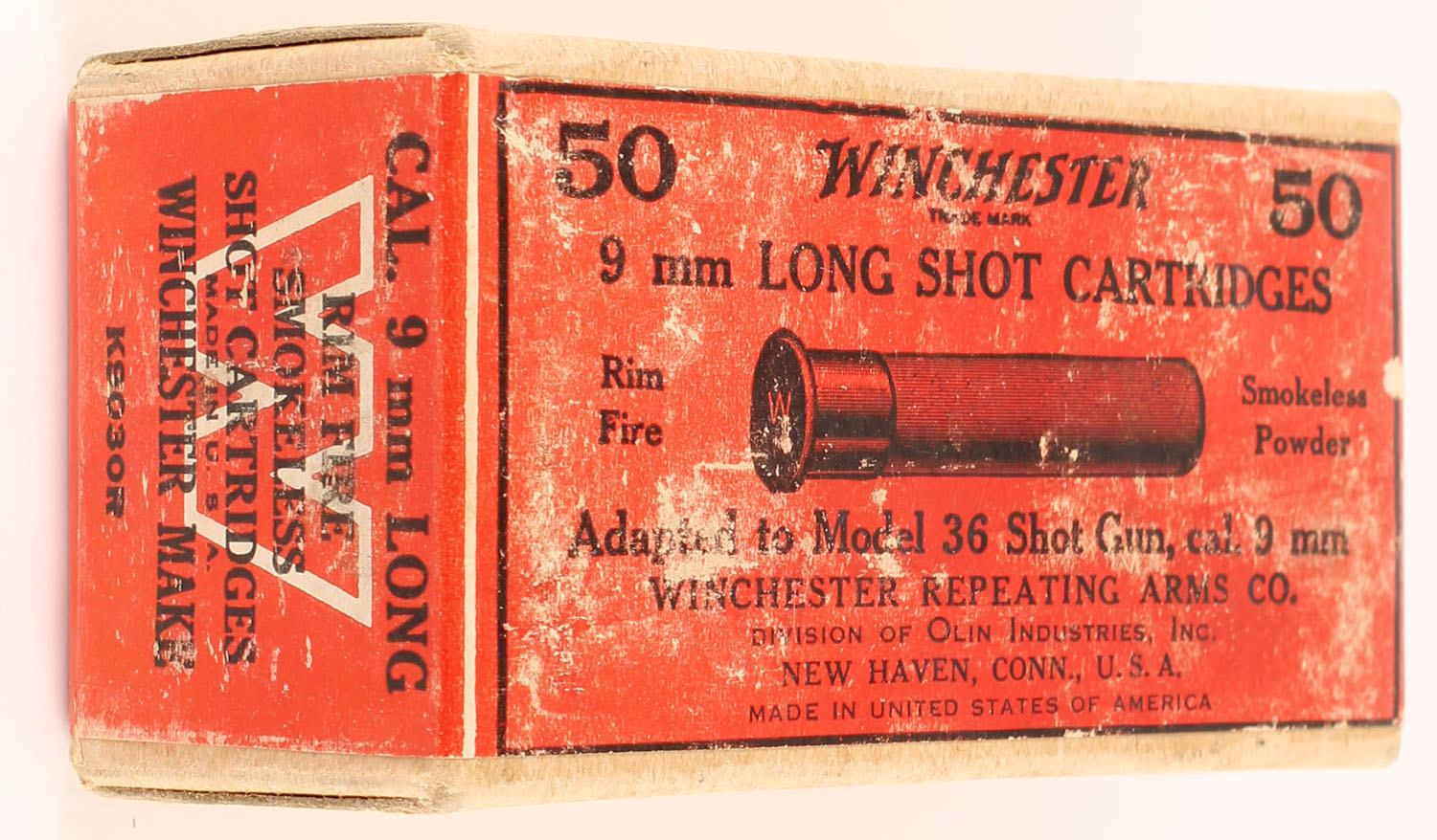 Winchester, 9mm Long Shot Cartridges, Rim Fire, FULL & SEALED, 2pc. Buff box with red wraparound label, box is solid with excellent color, some shelf wear, very minor corner wear, edges are mostly crisp, label is intact. Grade: Excellent + - Value: 150 to 225