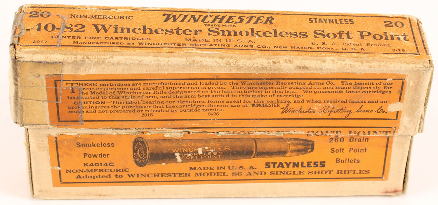 Winchester, Staynless, .40-82 Winchester, Smokeless, 260 Grain Soft Point Bullets, Full, 2pc. Buff box with orange labels, box is solid with very good to excellent color, minor age soiling, tape on left end of lid, some edge & corner wear, labels are intact, ammo is excellent. Grade: Very Good ++ - Value: 200 to 300