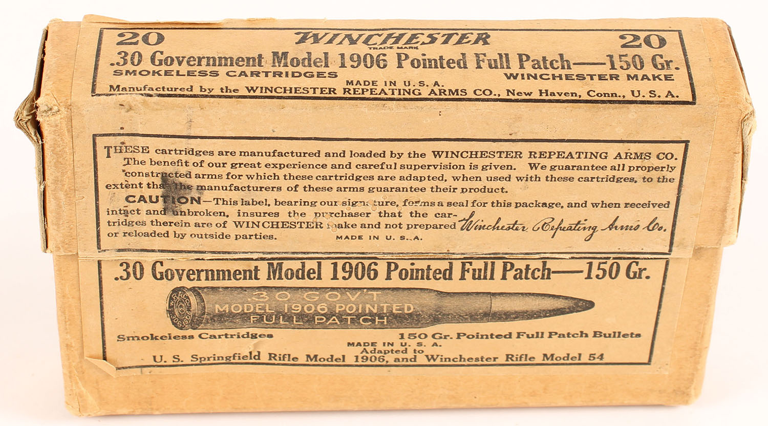 Winchester, Smokeless Cartridges, .30 Government Model 1906 (.30-06), 150 Gr. Pointed Full Patch Bullets, Full, 2pc. Buff box with buff labels, box is solid with excellent color, some corner wear, minor edge wear, labels are intact, ammo is excellent. Grade: Excellent + - Value: 16 to 24