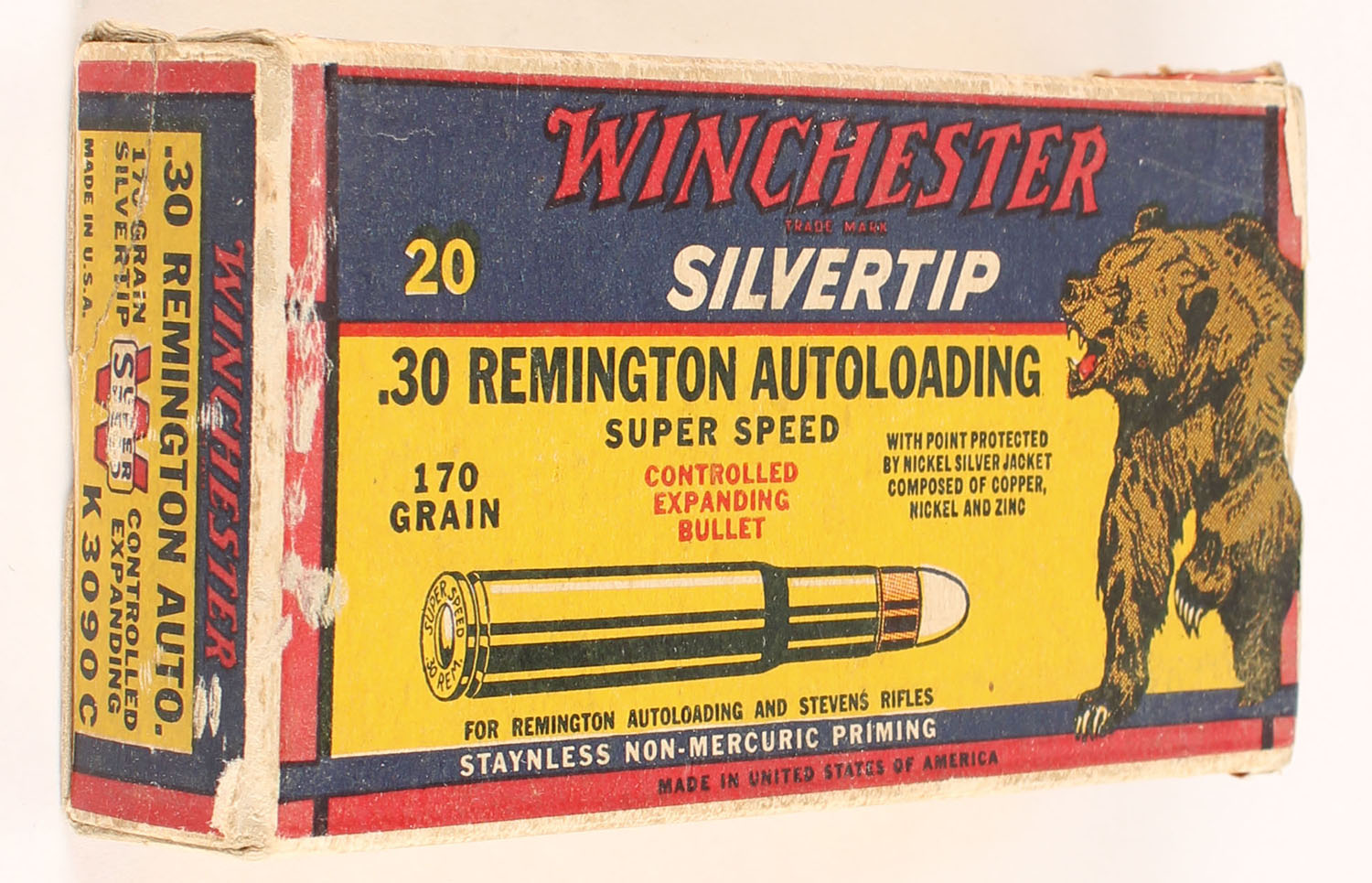 Winchester, Silvertip, .30 Remington Autoloading, 170 Grain Controlled Expanding Bullet, Full, 1pc. Yellow blue & red bear box, box is solid with excellent color, some shelf & corner wear, very minor edge wear, end flaps are solid, ammo is excellent. Grade: Excellent - Value: 80 to 120