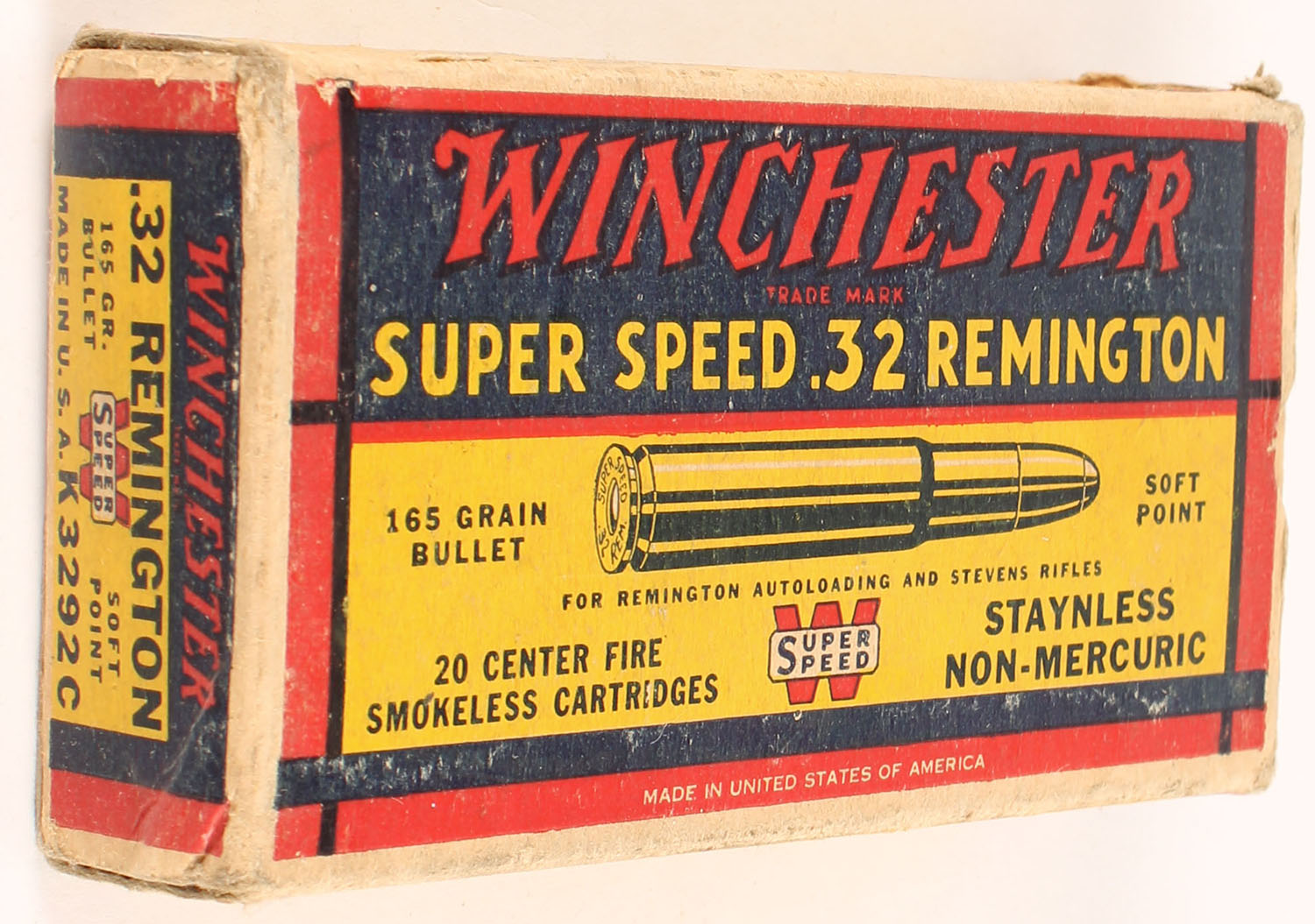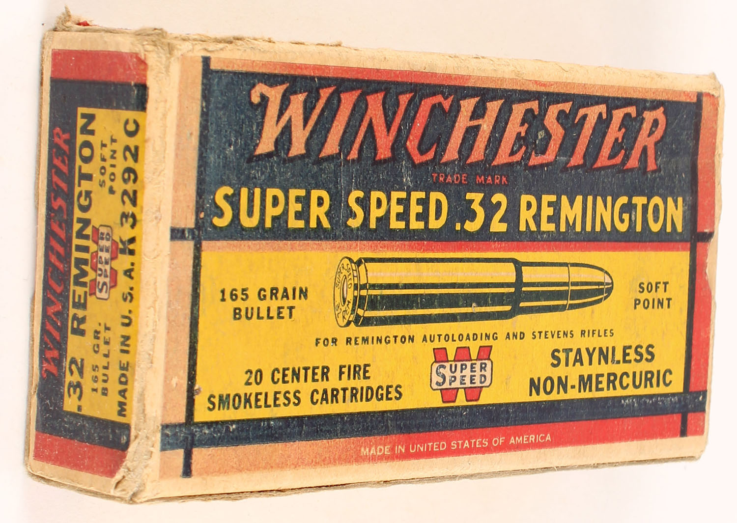 Winchester, Super Speed, .32 Remington, 165 Grain Soft Point Bullet, Full, 1pc. Yellow blue & red box, box is solid with good to very good color, some age soiling, color fading on top, corner wear, some edge wear, end flaps are solid, ammo is very good to excellent. Grade: Very Good + - Value: 50 to 75