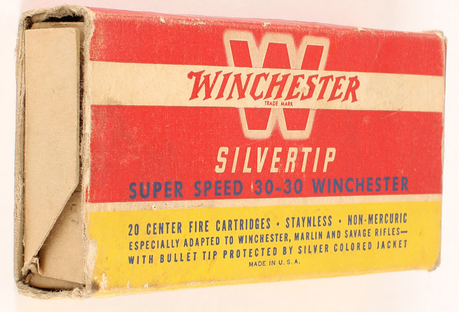 Winchester, Silvertip, .30-30 Winchester, 150 Grain Controlled Expanding Bullet, Full of incorrect ammo, 1pc. Red yellow & white box, missing left end flap, very good color, some age soiling & corner wear, minor edge wear, right end flap is solid, ammo is excellent. Grade: Good ++ - Value: 16 to 24