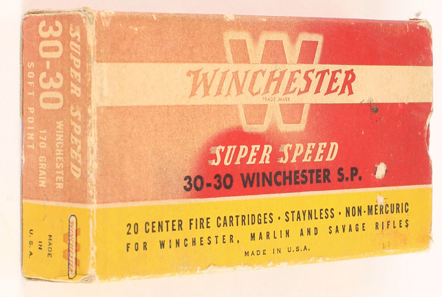 Winchester, Super Speed, .30-30 Winchester, 170 Grain Soft Point Bullet, Full, 1pc. Red yellow & white box, box is solid with good color, color fading on top, staining on front, some edge & corner wear, end flaps are solid, ammo is excellent. Grade: Very Good - Value: 20 to 30