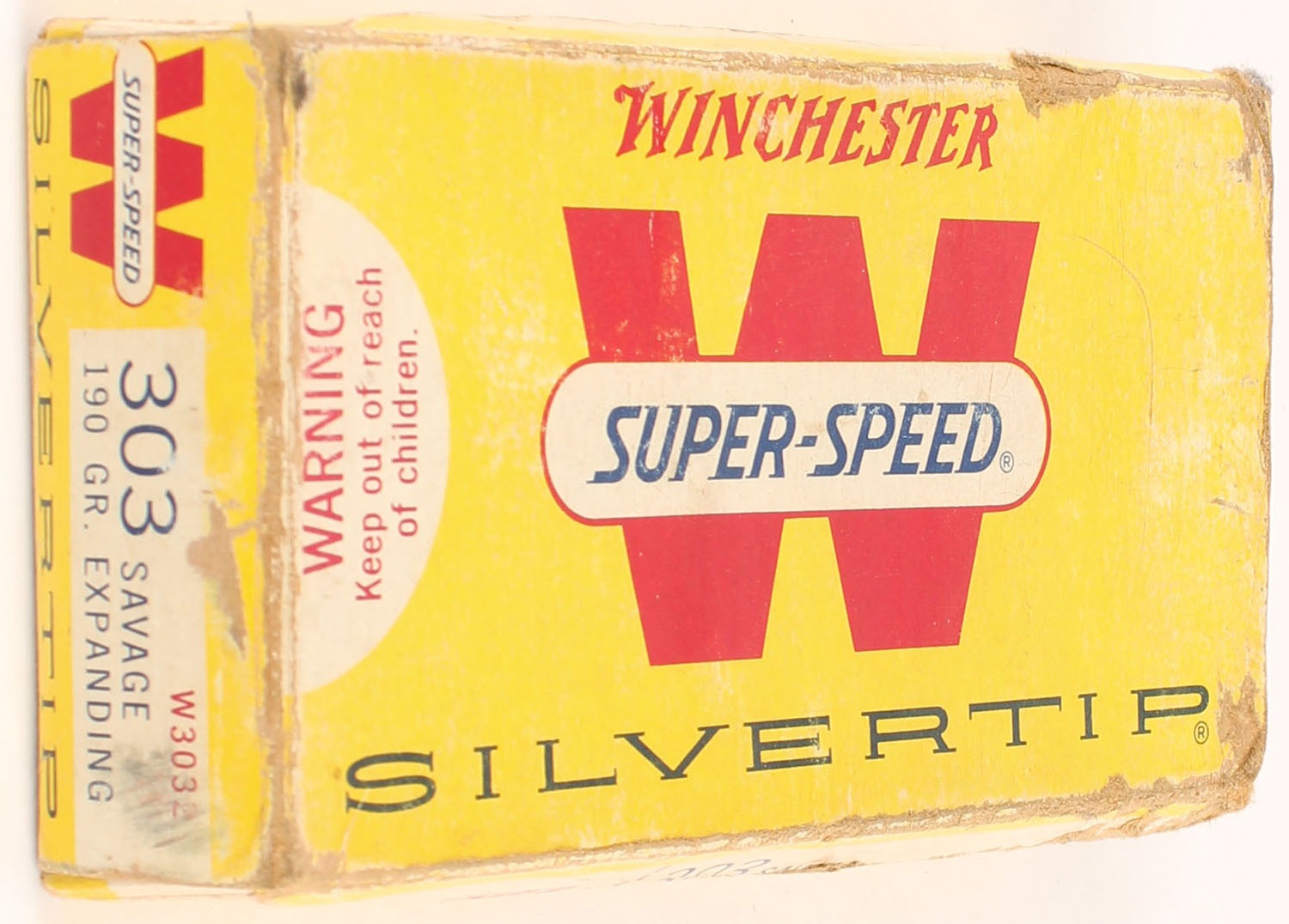 Winchester, Silvertip, .303 Savage, 190 Grain Expanding Bullet, Full (18 correct rds., 2 rds. Have correct H/S but are soft point bullets), 1pc. Yellow white & red box, box is solid with very good color, some shelf wear, right side and bottom have been written on, corner wear, some edge wear, end flaps are solid, ammo is excellent. Grade: Very Good - Value: 30 to 45