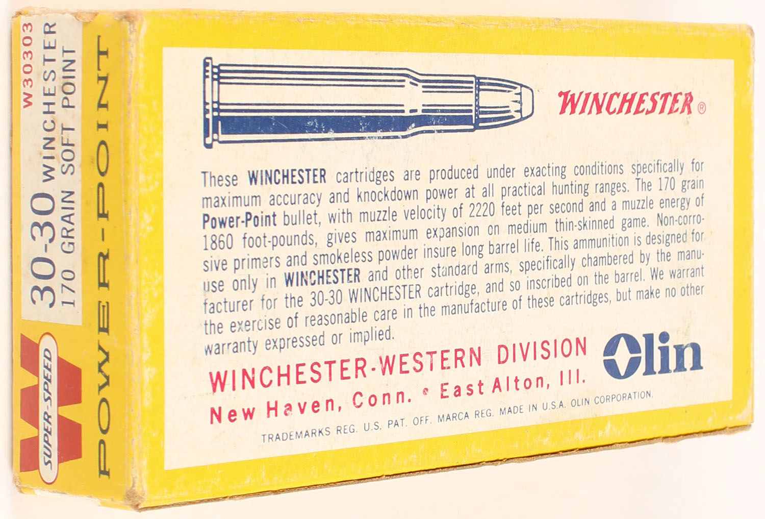 Winchester, Power-Point, .30-30 Winchester, 170 Grain Soft Point Bullet, Full, 1pc. Yellow white & red box, box is solid with excellent color, very minor shelf & corner wear, edges are mostly crisp, end flaps are solid, ammo is excellent. Grade: Excellent + - Value: 24 to 36
