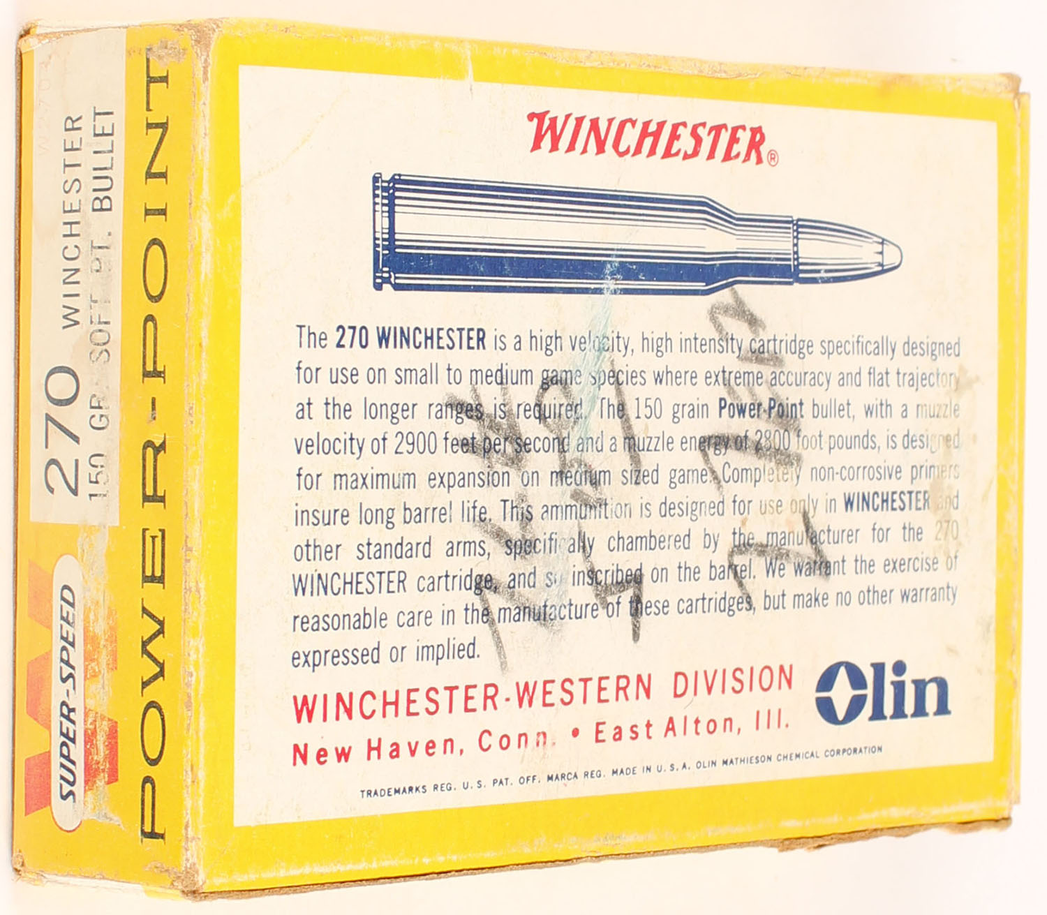 Winchester, Power-Point, .270 Winchester, 150 Grain Soft Point Bullet, Full, 1pc. Yellow white & red box, box is solid with excellent color, shelf wear, minor edge & corner wear, end flaps are solid, ammo is excellent. Grade: Very Good ++ - Value: 20 to 30