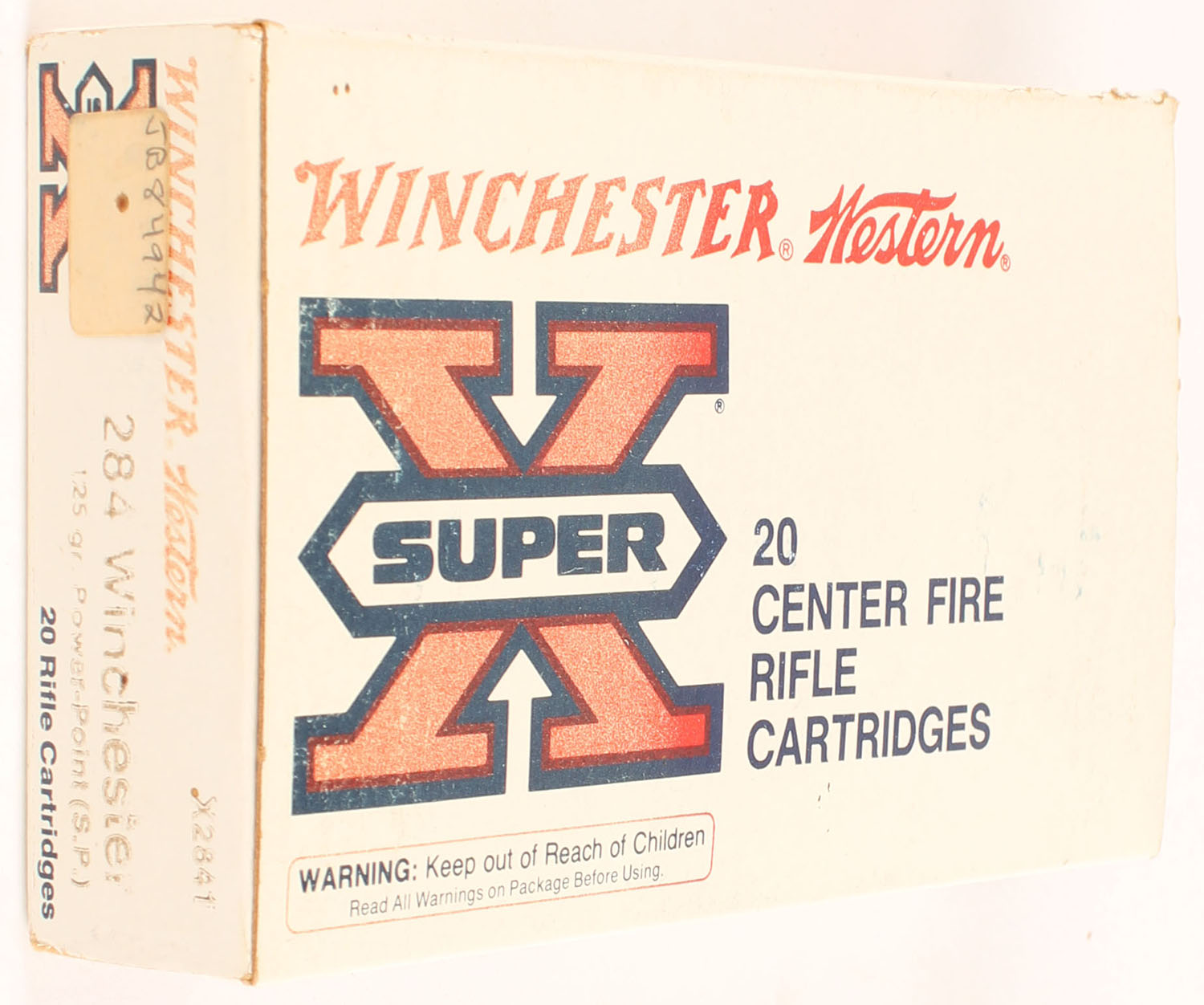 Winchester-Western, Super X, .284 Winchester, 125 Grain Power-Point, Full, 1pc. White red & black box, box is solid with excellent color, minor color fading, corners are mostly sharp, edges are mostly crisp, end flaps are solid, ammo is excellent. Grade: Excellent - Value: 60 to 90