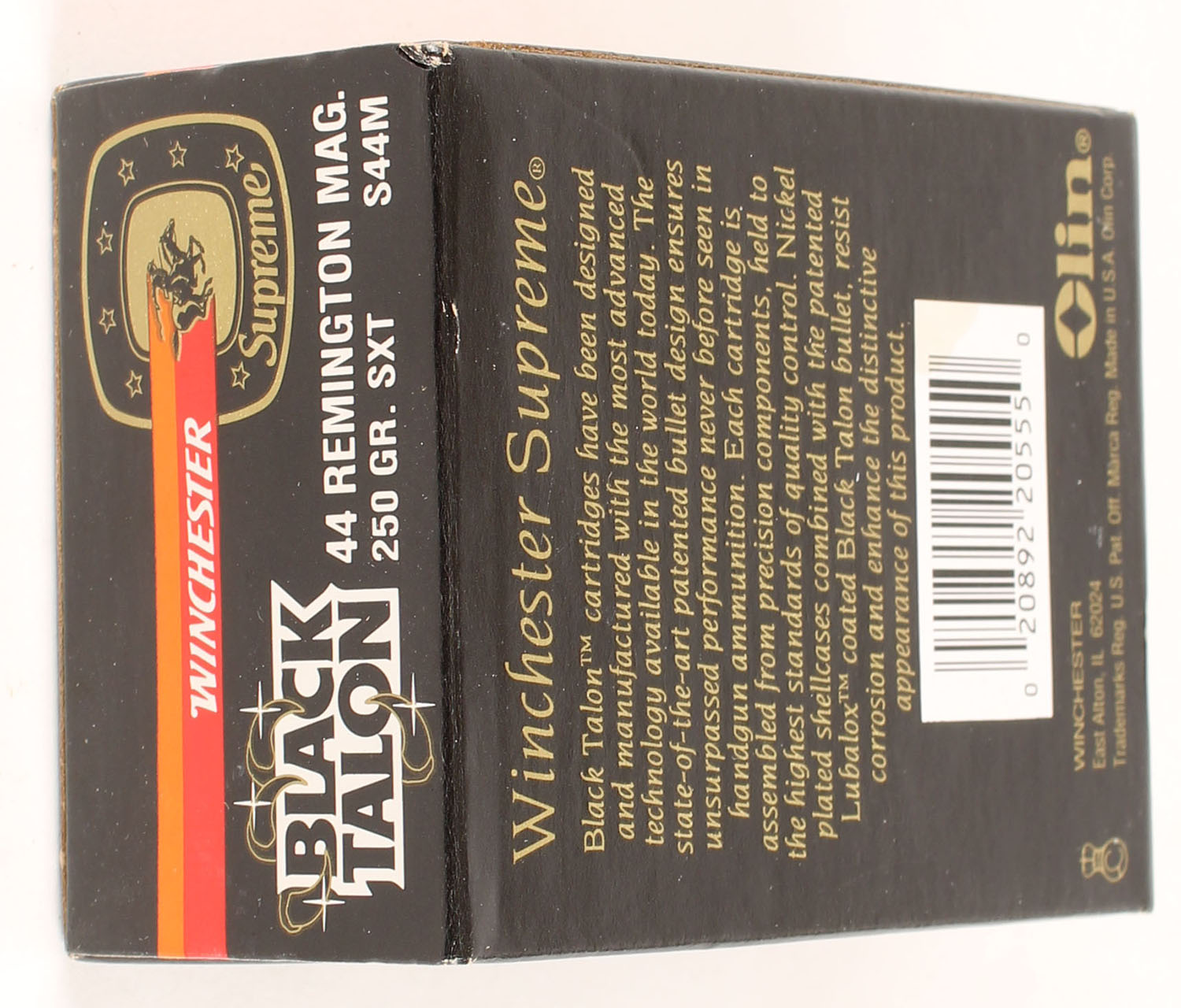 Winchester, Black Talon, .44 Remington Magnum, 250 Gr. SXT, Full, 1pc. Black red & orange box, box is MINT with minty color, corners are sharp, edges are crisp, end flaps are solid, ammo is minty. Grade: MINT - Value: 60 to 90