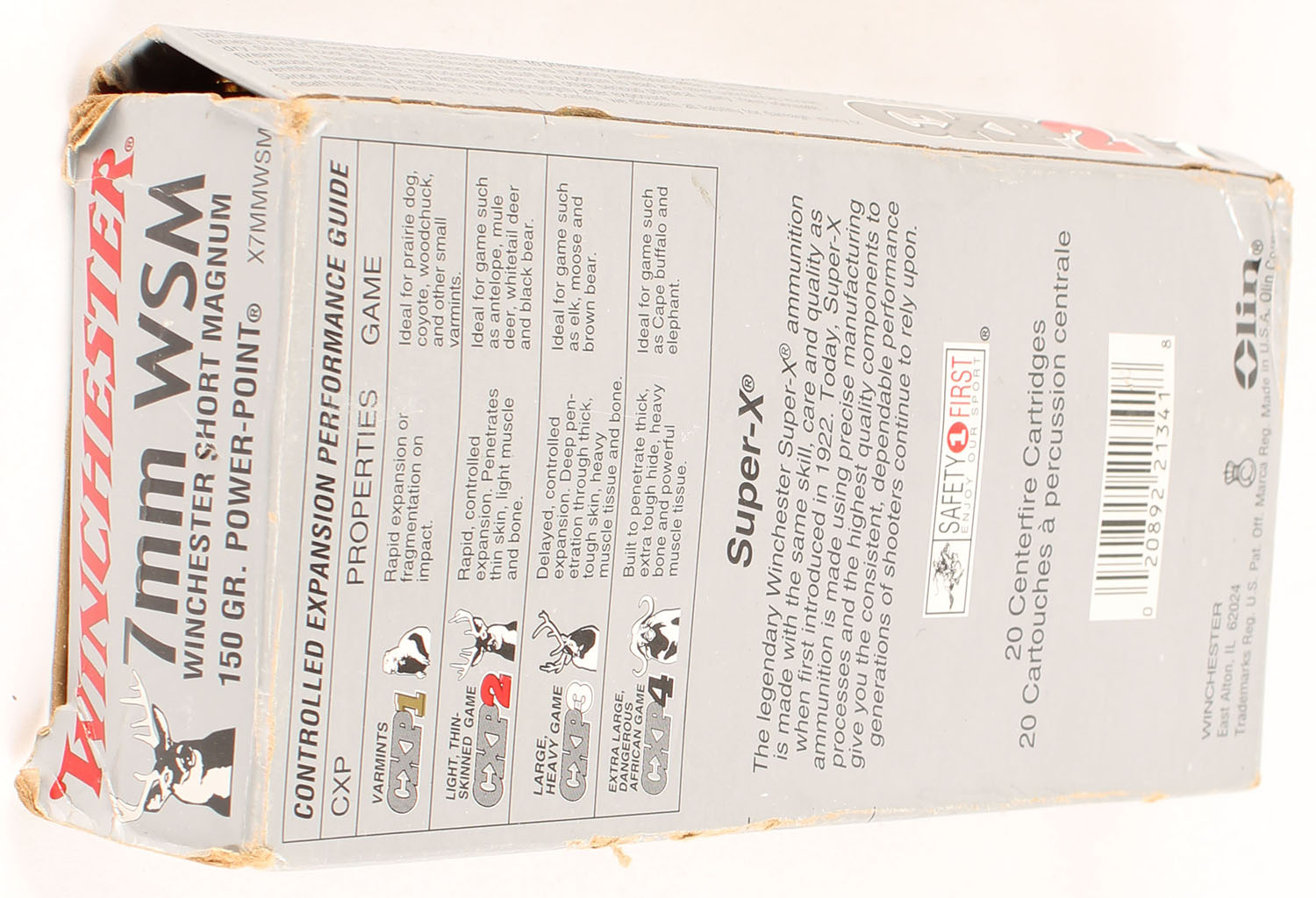 Winchester, Super X, 7mm WSM, 150 Grain Power-Point, Full, 1pc. Silver & red box, box is solid with excellent color, crease on top, some corner wear, very minor edge wear, end flaps are solid, ammo is excellent. Grade: Excellent - Value: 50 to 75