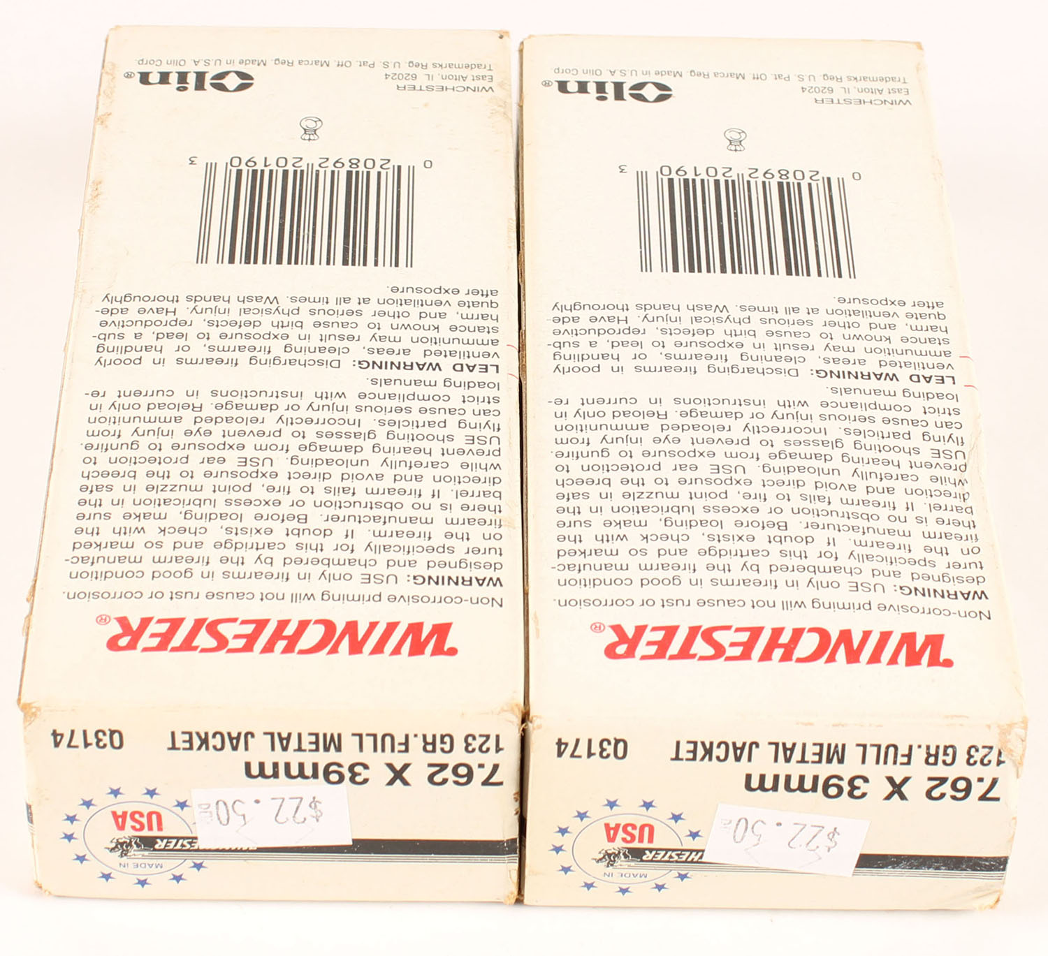 Winchester, Lot of (2), USA, 7.62 x 39mm, 123 Grain Full Metal Jacket, both boxes are full, solid with minty color, very minor corner wear, edges are crisp, end flaps are solid, ammo is minty. Grade: Excellent ++ - Value: 20 to 30