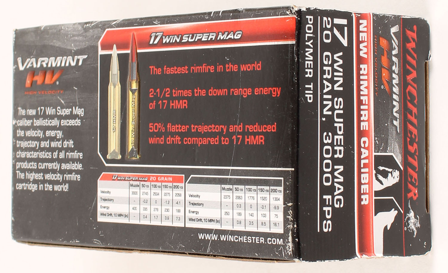 Winchester, Varmint GV, .17 Winchester Super Mag, Grain Polymer Tip, 3,000 FPS, Full, 1pc. Black & Red box, box is solid with excellent to minty color, very minor edge & corner wear, end flaps are solid, ammo is minty. Grade: Excellent - Value: 20 to 30