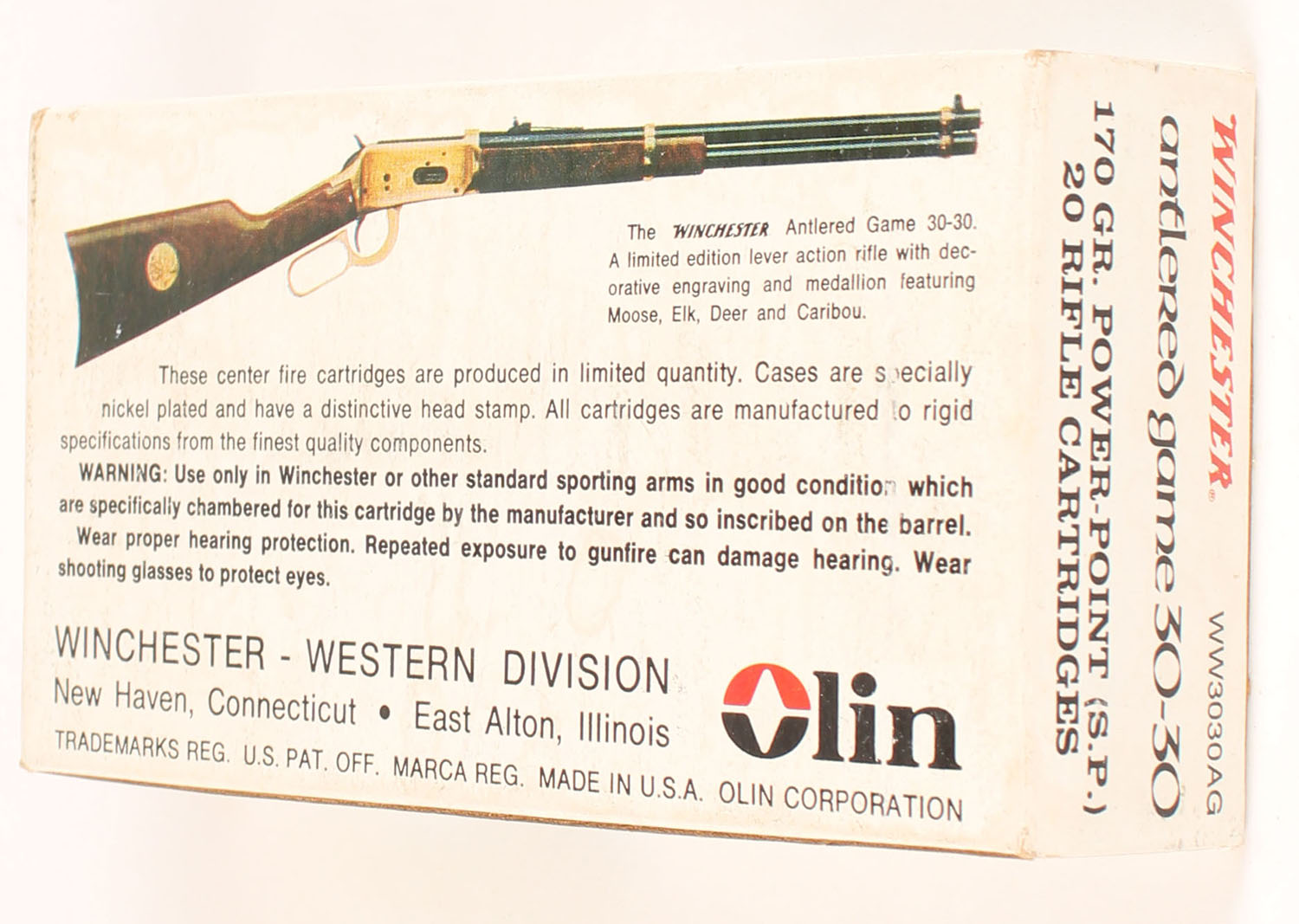 Winchester, antlered game, .30-30 Winchester, 170 Grain Power-Point, Partial 18rds. 1pc. Multi-colored box, box is solid with excellent color, some shelf wear, very minor corner wear, edges are mostly crisp, end flaps are solid, ammo is minty. Grade: Excellent - Value: 60 to 90
