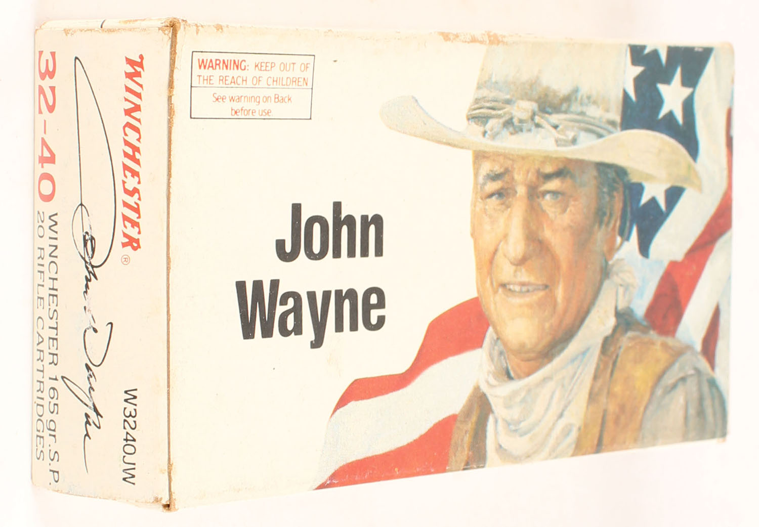 Winchester, John Wayne, .32-40 Winchester, 165 Grain Soft Point, Full, 1pc. White box featuring John Wayne, box is solid with excellent color, very minor age soiling, minor edge & corner wear, end flaps are solid, ammo is minty. Grade: Excellent - Value: 80 to 120