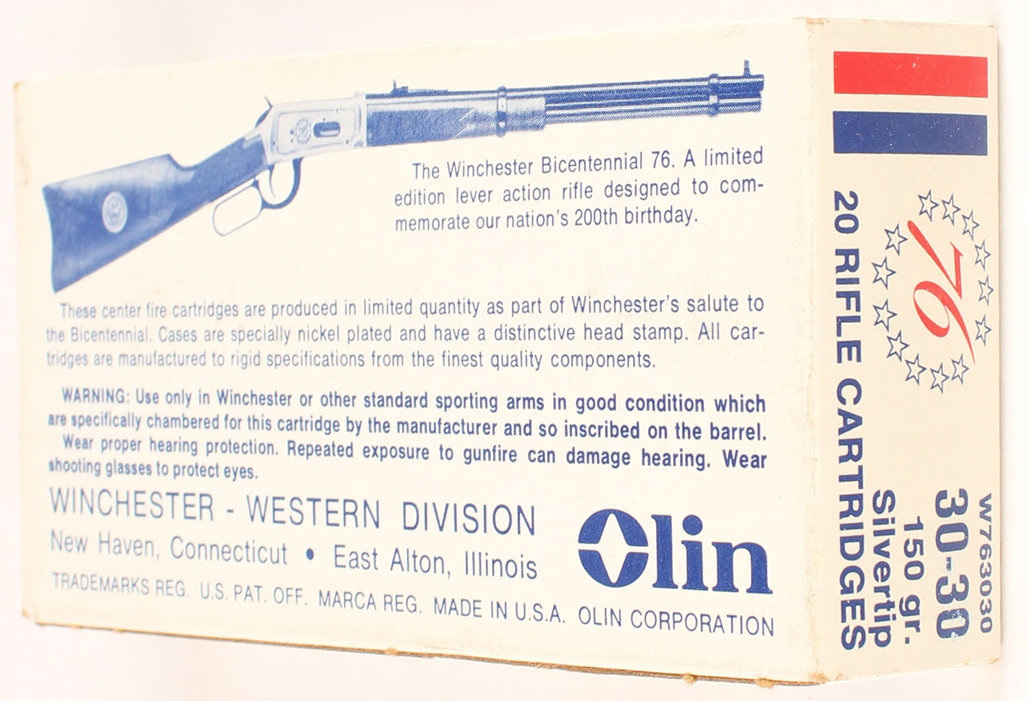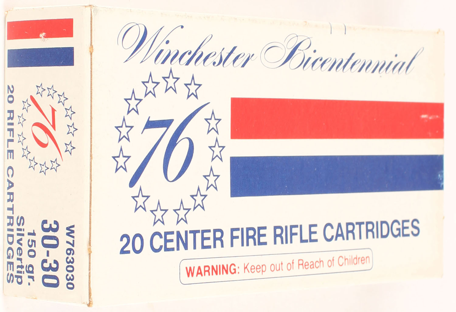 Winchester, Bicentennial, .30-30 Winchester, 150 Gr. Silvertip, Full, 1pc. White blue & red box, box is solid with excellent color, very minor edge & corner wear, end flaps are solid, ammo is minty. Grade: Excellent ++ - Value: 40 to 60