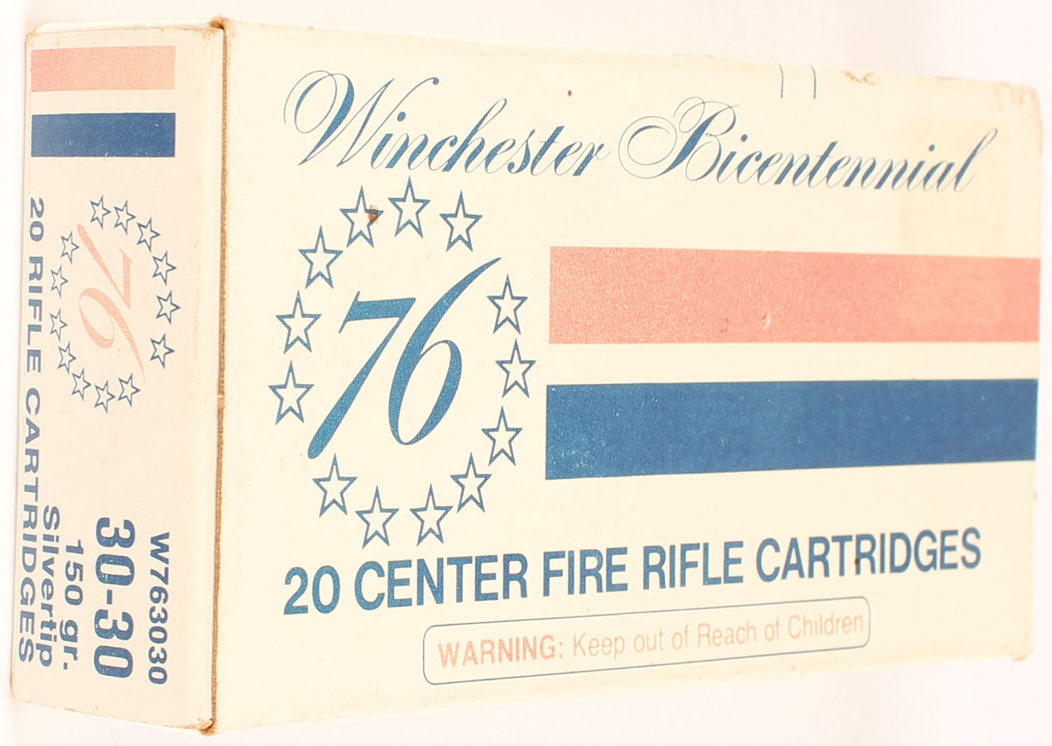 Winchester, Bicentennial, .30-30 Winchester, 150 Gr. Silvertip, Full, 1pc. White blue & red box, box is solid with very good color, some color fading on top, sticker residue on top, minor corner wear, edges are crisp, end flaps are solid, ammo is minty. Grade: Very Good ++ - Value: 36 to 52