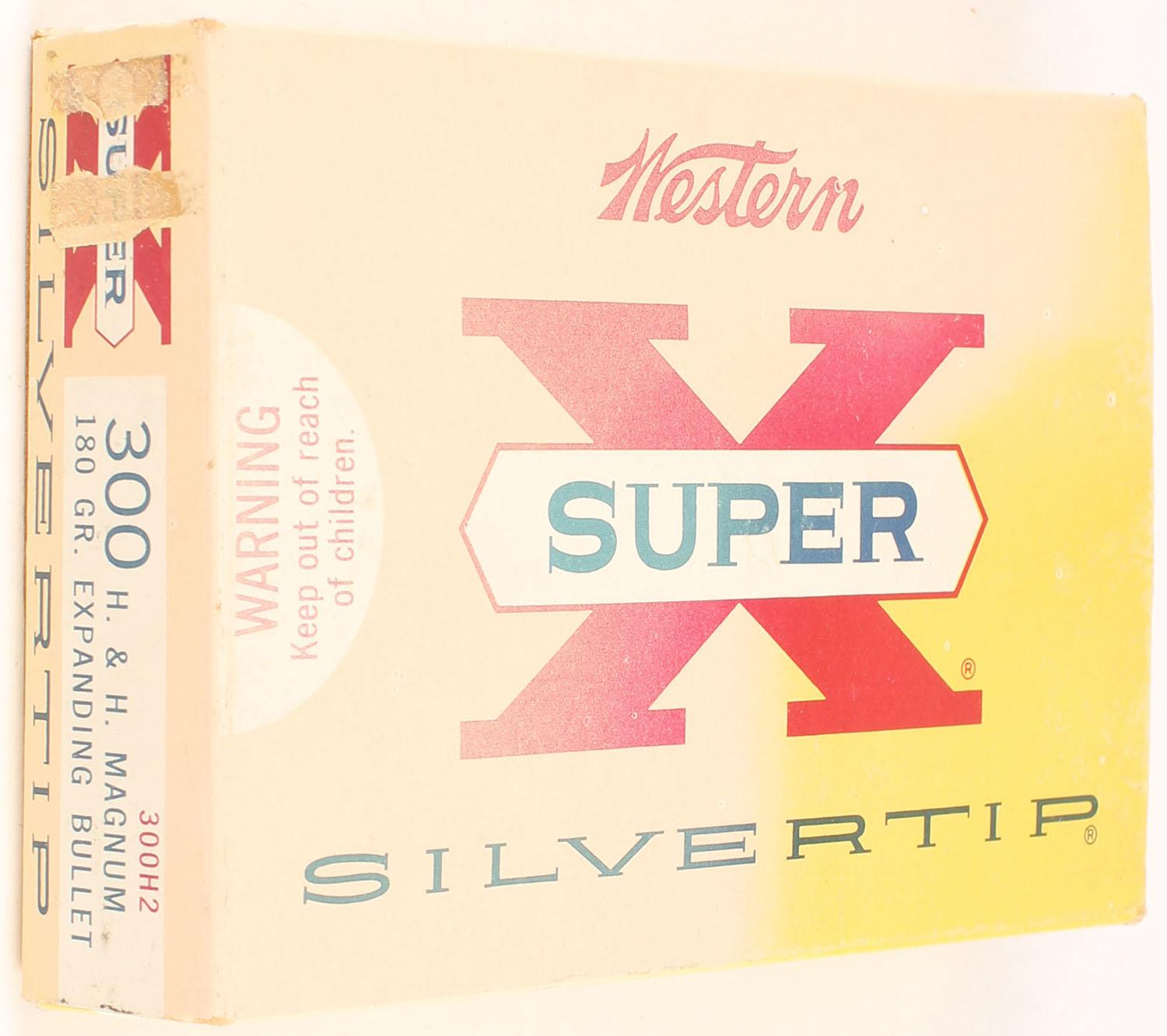 Western, Super X Silvertip, .300 H&H Magnum, 180 Grain Expanding Bullet, Full, 1pc. Yellow white & red box, box is solid with good color, color fading on top, minor corner wear, edges are mostly crisp, end flaps are solid, ammo is excellent to minty. Grade: Very Good - Value: 80 to 120