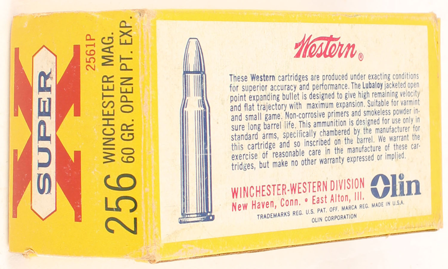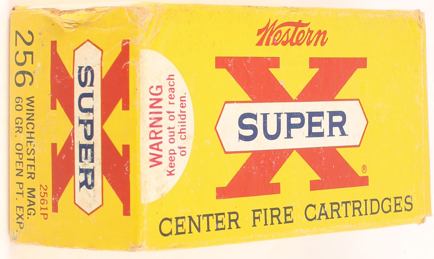 Western, Super X, .256 Winchester Magnum, 60 Grain Open Point Expanding, Full, 1pc. Yellow white & red box, box is solid with excellent color, very minor shelf wear, corner ding on top back corner, minor corner wear otherwise, edges are mostly crisp, end flaps are solid, ammo is excellent. Grade: Very Good ++ - Value: 100 to 150