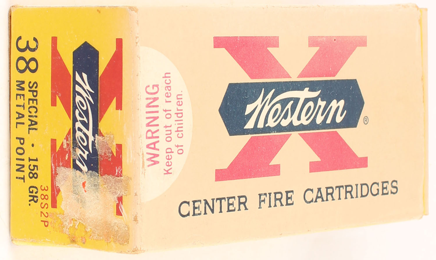 Western, X, .38 Special, 158 Grain Metal Point, Full, 1pc. Yellow white & red box, box is solid with good color, color fading on top, very minor corner wear, edges are crisp, end flaps are solid, ammo is excellent. Grade: Very Good - Value: 24 to 36