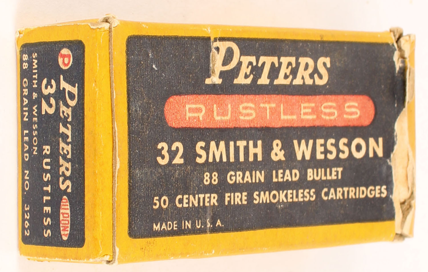 Peters, Rustless, .32 Smith & Wesson, 88 Grain Lead Bullet, Partial 49rds., 1pc. Blue yellow & red box, box is solid with very good color, some color fading, tear on top, very minor corner wear, edges are mostly crisp, end flaps are solid, ammo is excellent. Grade: Very Good - Value: 20 to 30